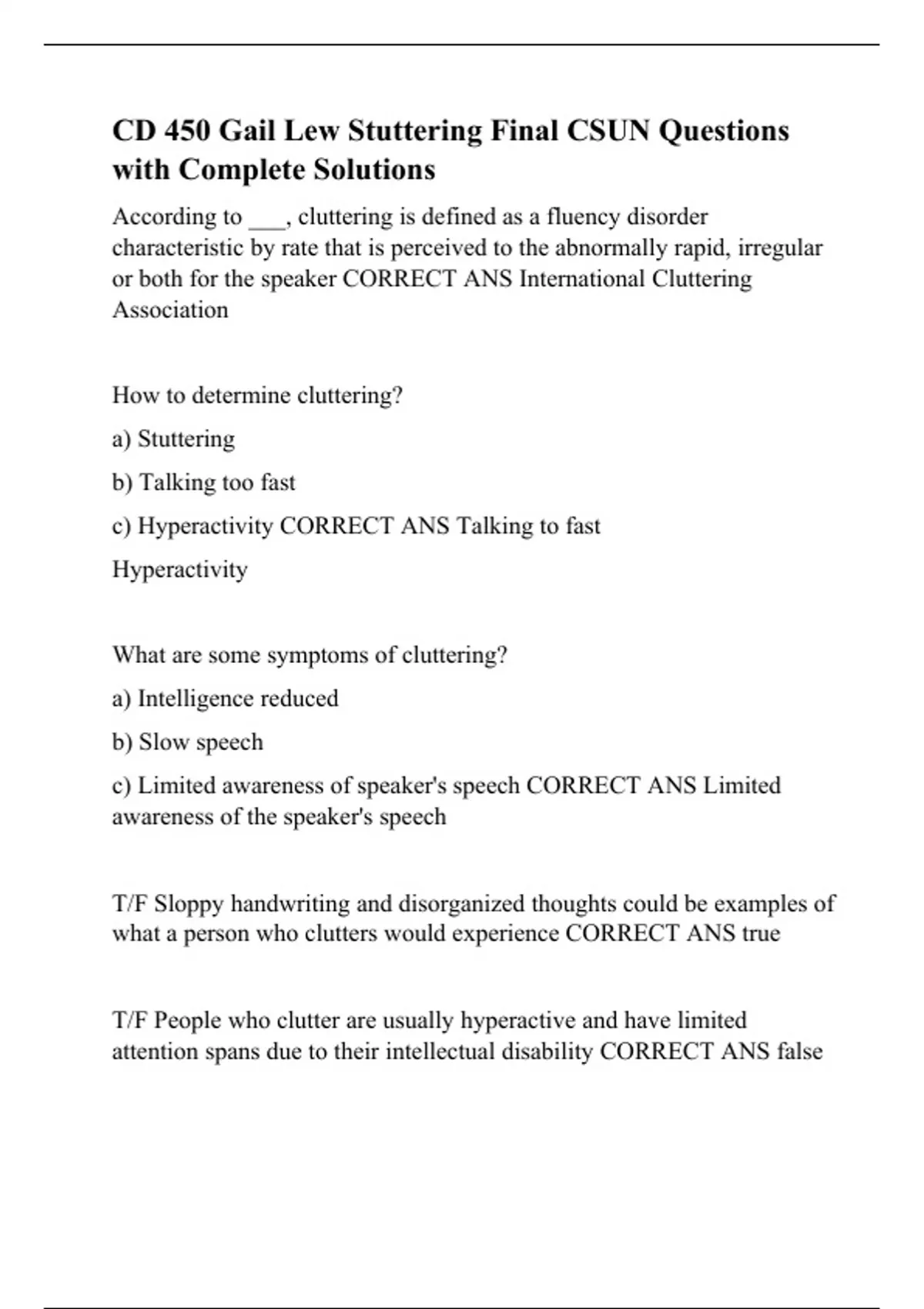 CD 450 Gail Lew Stuttering Final CSUN Questions with Complete Solutions.