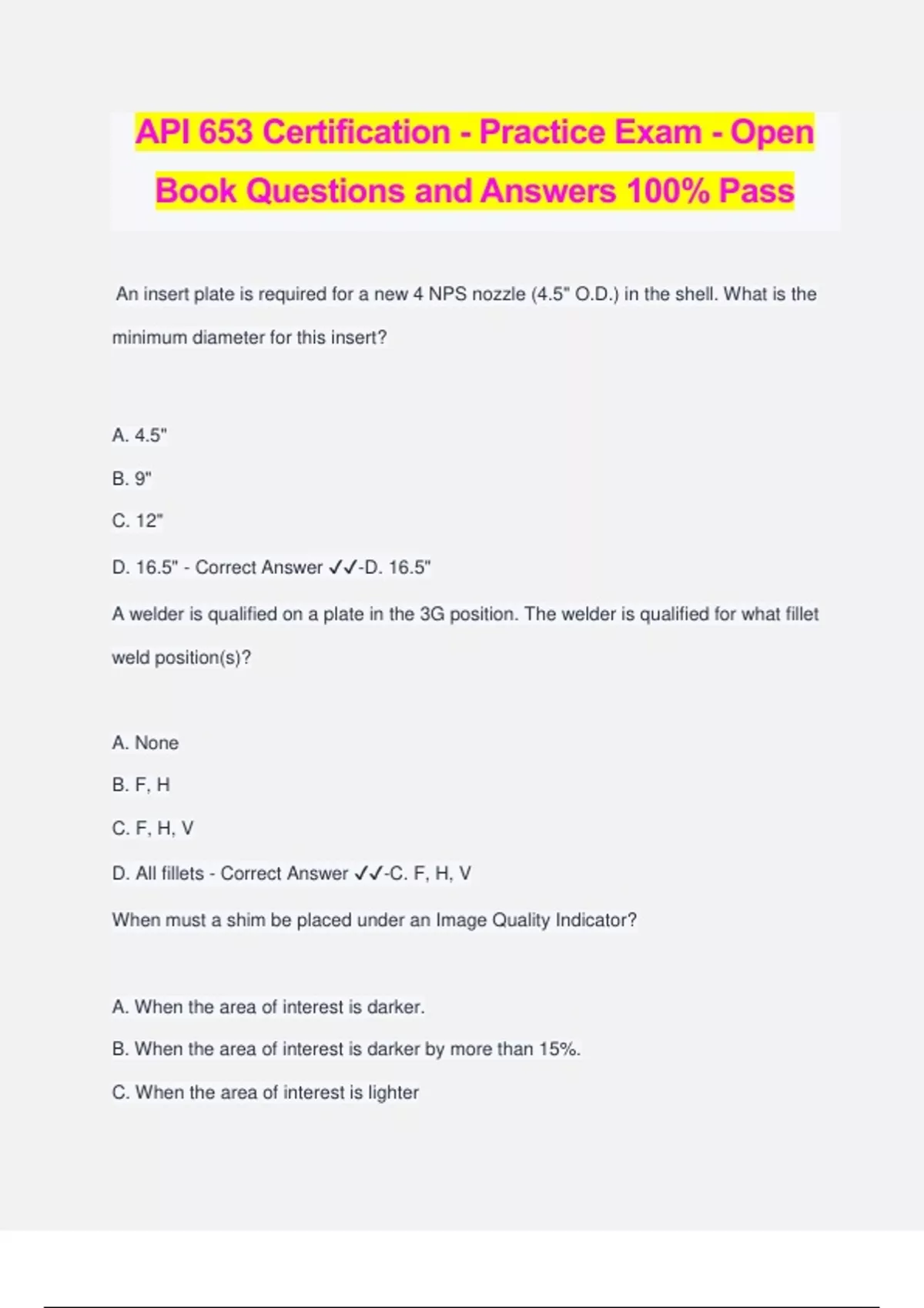 API 653 Certification - Practice Exam - Open Book Questions and Answers 100% Pass An insert plate is required for a new 4 NPS nozzle (4.5" O.D.) in the shell. What is the minimum diameter for this insert? A. 4.5" B. 9" C. 12" D. 16.5" - Correct Answer ️️ -D. 16.5" A welder is qualified on a plate in the 3G position. The welder is qualified for what fillet weld position(s)? A. None B. F, H C. F, H, V D. All fillets - Correct Answer ️️ -C. F, H, V When must a shim be placed under an Image Quality Indicator? A. When the area of interest is darker. B. When the area of interest is darker by more than 15%. C. When the area of interest is lighter D. When the area of interest is lighter by more than 15%. - Correct Answer ️️ -D. When the area of interest is lighter by more than 15%. A welder passes a qualification test using a 3 NPS pipe with a groove weld. What is the maximum pipe diameter that the welder is now qualified to weld? A. 2-7/8" B. 4" C. 8" D. Unlimited - Correct Answer ️️ -D. Unlimited A portion of a 1/2" thick shell plate is replaced. What is the closest distance allowed between this plate and the adjacent vertical weld? A. 3" B. 6" C. 10" D. 12" - Correct Answer ️️ -B. 6" Tank Number: T-100 Diameter: 114' Specific Gravity: 0.9 Plate Material: A-283 gr C Shell Corrosion Rate: 0.003"/yr Allowable Liquid Height: 40' Construction Code: API 650 4th Edition A corroded area is found 3' from the bottom and 4" from the nearest weld. The lowest reading in the locally corroded area is 0.368". What is the critical length "L" in the corroded area? A. 12" B. 24" C. 25" D. 40" - Correct Answer ️️ -B. 24" Tank Number: T-100 Diameter: 114' Specific Gravity: 0.9 Plate Material: A-283 gr C Shell Corrosion Rate: 0.003"/yr Allowable Liquid Height: 40' Construction Code: API 650 4th Edition A corroded area is found 3' from the bottom and 4" from the nearest weld. The lowest reading in the locally corroded area is 0.368". What is the required thickness "tmin" in this corroded area?
