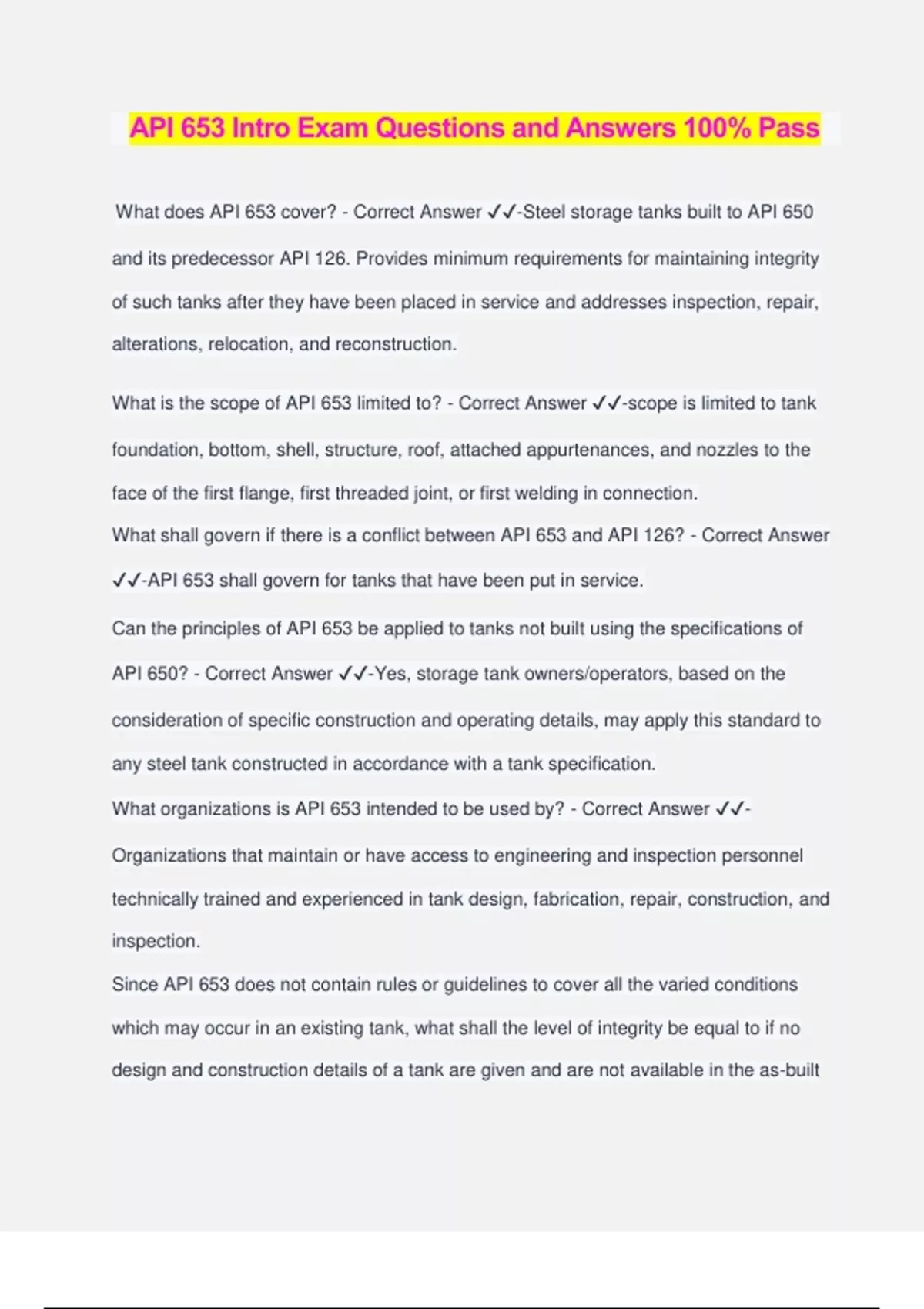 API 653 Intro Exam Questions and Answers 100% Pass What does API 653 cover? - Correct Answer ️️ -Steel storage tanks built to API 650 and its predecessor API 126. Provides minimum requirements for maintaining integrity of such tanks after they have been placed in service and addresses inspection, repair, alterations, relocation, and reconstruction. What is the scope of API 653 limited to? - Correct Answer ️️ -scope is limited to tank foundation, bottom, shell, structure, roof, attached appurtenances, and nozzles to the face of the first flange, first threaded joint, or first welding in connection. What shall govern if there is a conflict between API 653 and API 126? - Correct Answer ️️ -API 653 shall govern for tanks that have been put in service. Can the principles of API 653 be applied to tanks not built using the specifications of API 650? - Correct Answer ️️ -Yes, storage tank owners/operators, based on the consideration of specific construction and operating details, may apply this standard to any steel tank constructed in accordance with a tank specification. What organizations is API 653 intended to be used by? - Correct Answer ️️ - Organizations that maintain or have access to engineering and inspection personnel technically trained and experienced in tank design, fabrication, repair, construction, and inspection. Since API 653 does not contain rules or guidelines to cover all the varied conditions which may occur in an existing tank, what shall the level of integrity be equal to if no design and construction details of a tank are given and are not available in the as-built