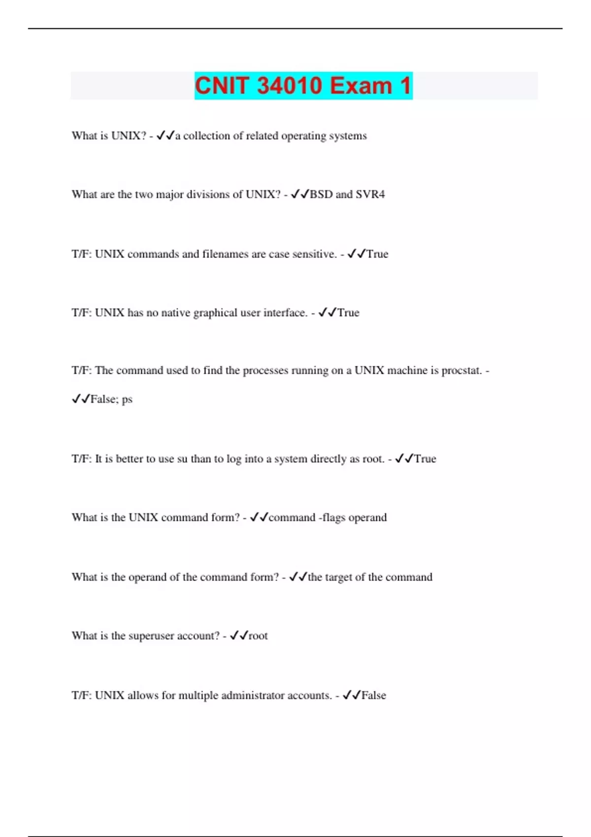 CNIT 34010 Exam 1 What is UNIX? - a collection of related operating systems What are the two major divisions of UNIX? - BSD and SVR4 T/F: UNIX commands and filenames are case sensitive. - True T/F: UNIX has no native graphical user interface. - True T/F: The command used to find the processes running on a UNIX machine is procstat. - False; ps T/F: It is better to use su than to log into a system directly as root. - True What is the UNIX command form? - command -flags operand What is the operand of the command form? - the target of the command What is the superuser account? - root T/F: UNIX allows for multiple administrator accounts. - False In UNIX UID 0 (zero) has special meaning. UID 0 is by definition the _____________ user. - root T/F: The tape archive (tar) command merges and compresses multiple files into a single file. - False T/F: In UNIX, groups can contain other groups. - False T/F: UNIX password hashes are kept in the /etc/passwd file. - False; /etc/shadow The configuration file where the list of DNS servers to use is set: - /etc/ T/F: The BSD ports collection installs software via source code. - True The configuration file where the fully qualified domain name (such as ) is set: - /etc/hosts T/F: A major consideration when installing UNIX software is handling dependencies. - True T/F: In UNIX the default gateway is specified using the route command. - True In which file would you find the user's primary group? - /etc/passwd T/F;IP addresses can be checked in UNIX using the ipconfig command. - False; ifconfig What are the types of shells? - 1. Login Shell 2. Interactive Shell 3. Non-Interactive Shell - started automatically at user login - specified in the /etc/passwd file - when closed, the user logs out - login shell the command line parser used to interact with the system - UNIX Shell a non-login shell into which users enter commands - interactive shell - normally contains a script - inherits environment variables from parent shell - non-interactive shell T/F: In UNIX, everything is treated as a file. - True introduced command line history and tab completion - /bin/ksh (Korn Shell) standard scripting shell for most Linux distributions - /bin/bash The only hard mount point in UNIX: - root executable files required for basic operations - /bin placeholders for devices - /dev configuration information - /etc system binaries - /sbin placeholders for running processes - /proc user directories - /home installed applications - /usr variable files: logging, spooling , cache - /var temporary files - /tmp T/F: Filesystems can be used without being mounted to the root filesystem. - False T/F: Filesystems must be mounted over an existing directory before being used. - True command in which filesystems are mounted - mount /dev/device /mount_point command in which filesystems are unmounted - umount /mount_point The configuration file that lists filesystems to automatically mount: - /etc/fstab Required partitions: - /