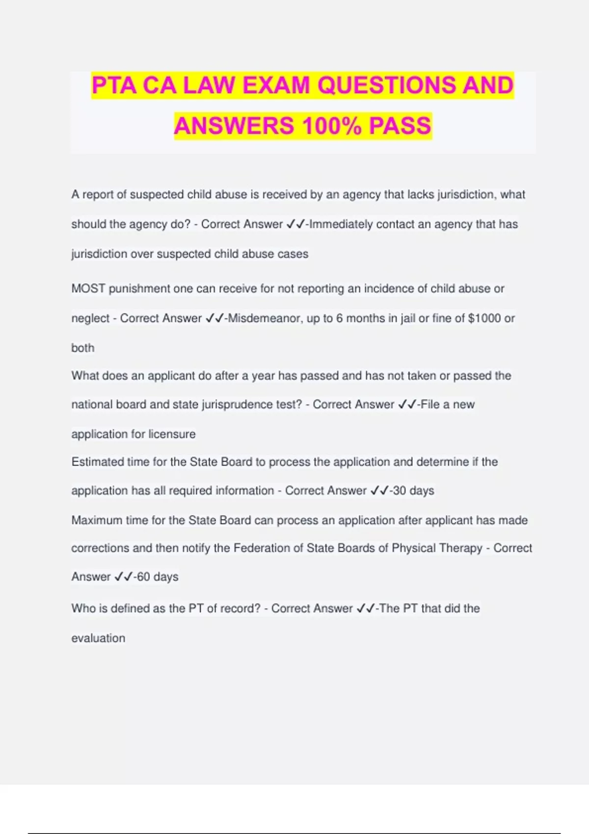 PTA CA LAW EXAM QUESTIONS AND ANSWERS 100% PASS A report of suspected child abuse is received by an agency that lacks jurisdiction, what should the agency do? - Correct Answer ️️ -Immediately contact an agency that has jurisdiction over suspected child abuse cases MOST punishment one can receive for not reporting an incidence of child abuse or neglect - Correct Answer ️️ -Misdemeanor, up to 6 months in jail or fine of $1000 or both What does an applicant do after a year has passed and has not taken or passed the national board and state jurisprudence test? - Correct Answer ️️ -File a new application for licensure Estimated time for the State Board to process the application and determine if the application has all required information - Correct Answer ️️ -30 days Maximum time for the State Board can process an application after applicant has made corrections and then notify the Federation of State Boards of Physical Therapy - Correct Answer ️️ -60 days Who is defined as the PT of record? - Correct Answer ️️ -The PT that did the evaluation