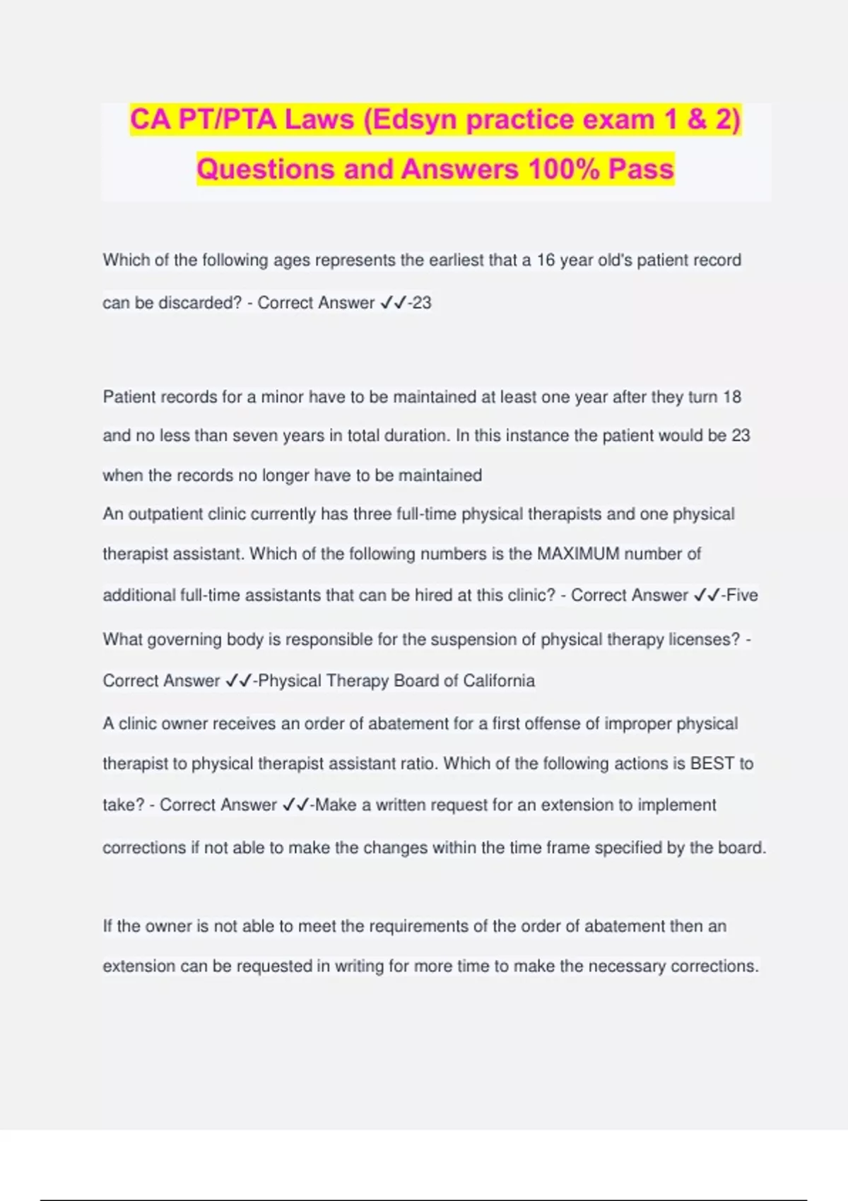 CA PT/PTA Laws (Edsyn practice exam 1 & 2) Questions and Answers 100% Pass Which of the following ages represents the earliest that a 16 year old's patient record can be discarded? - Correct Answer ️️ -23 Patient records for a minor have to be maintained at least one year after they turn 18 and no less than seven years in total duration. In this instance the patient would be 23 when the records no longer have to be maintained An outpatient clinic currently has three full-time physical therapists and one physical therapist assistant. Which of the following numbers is the MAXIMUM number of additional full-time assistants that can be hired at this clinic? - Correct Answer ️️ -Five What governing body is responsible for the suspension of physical therapy licenses? - Correct Answer ️️ -Physical Therapy Board of California A clinic owner receives an order of abatement for a first offense of improper physical therapist to physical therapist assistant ratio. Which of the following actions is BEST to take? - Correct Answer ️️ -Make a written request for an extension to implement corrections if not able to make the changes within the time frame specified by the board. If the owner is not able to meet the requirements of the order of abatement then an extension can be requested in writing for more time to make the necessary corrections. To discuss patient care with the therapist of record, it is BEST to talk with the physical therapist who: - Correct Answer ️️ -did the initial evaluation The therapist of record is the therapist who completed the initial evaluation. The therapist of record can be transferred, but it must occur in writing. Which of the following terms is interchangeable with "physical therapy"? - Correct Answer ️️ -Physiotherapy A direct access patient has been seen for three sessions, including the evaluation. It has been 40 days since the evaluation, and today's session occurs on a Friday. The patient desires to schedule an additional appointment for the following week. Which of the following days of the week is the LAST day the licensee can see the patient? - Correct Answer ️️ -Wednesday A patient can be seen via direct access for 45 calendar days or 12 visits, whichever comes first. Following that duration, a signature from a physician on the plan of care is required. Including the weekend the 45th day falls upon the following Wednesday. A member of the Physical Therapy Board of California is performing a review following a patient complaint claiming unprofessional conduct of a treating licensee. As part of the review, the board member asks to see the patient's records. Which of the following actions is the MOST appropriate? - Correct Answer ️️ -Obtain written permission from the patient to release the records