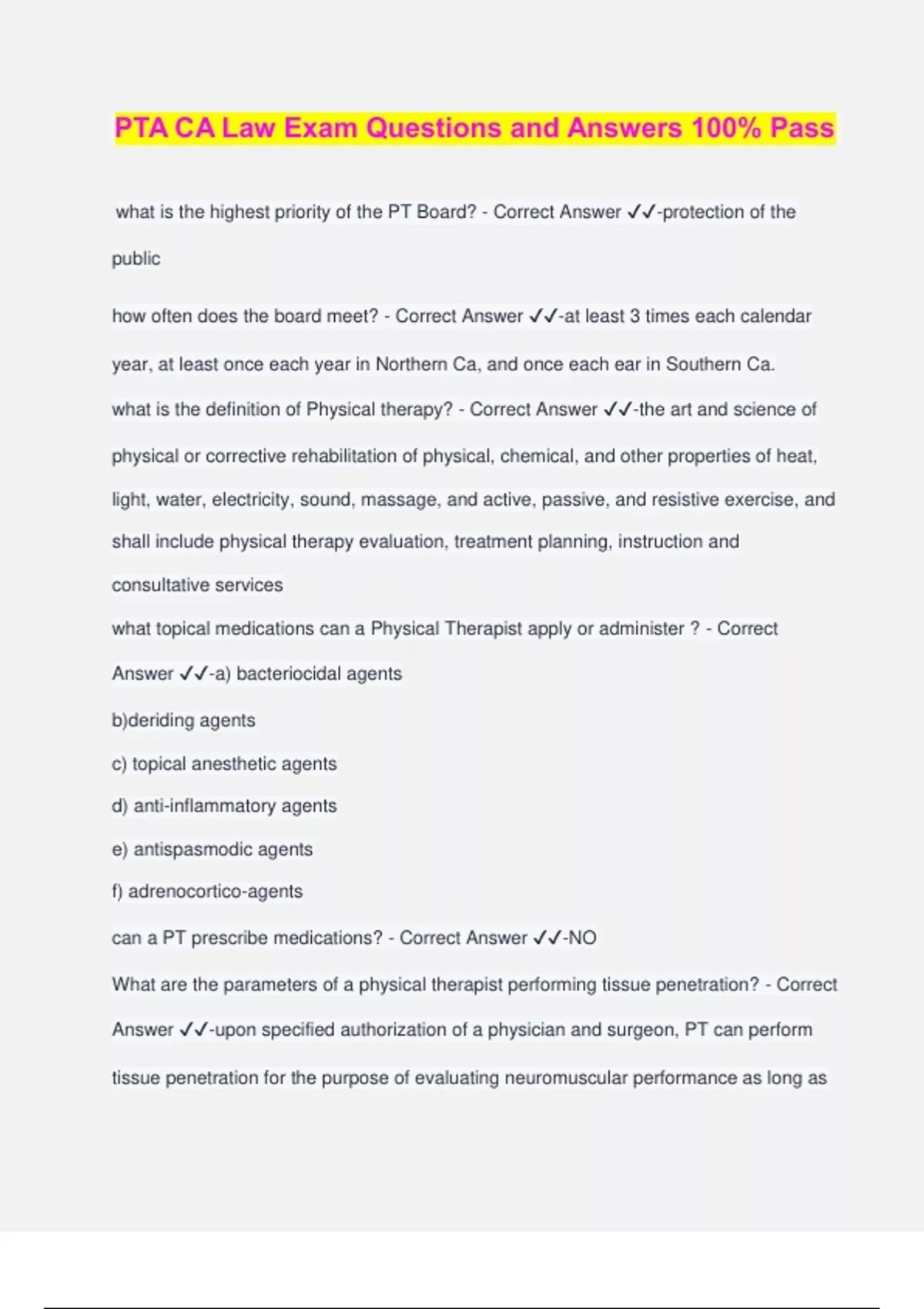 PTA CA Law Exam Questions and Answers 100% Pass what is the highest priority of the PT Board? - Correct Answer ️️ -protection of the public how often does the board meet? - Correct Answer ️️ -at least 3 times each calendar year, at least once each year in Northern Ca, and once each ear in Southern Ca. what is the definition of Physical therapy? - Correct Answer ️️ -the art and science of physical or corrective rehabilitation of physical, chemical, and other properties of heat, light, water, electricity, sound, massage, and active, passive, and resistive exercise, and shall include physical therapy evaluation, treatment planning, instruction and consultative services what topical medications can a Physical Therapist apply or administer ? - Correct Answer ️️ -a) bacteriocidal agents b)deriding agents c) topical anesthetic agents d) anti-inflammatory agents e) antispasmodic agents f) adrenocortico-agents can a PT prescribe medications? - Correct Answer ️️ -NO What are the parameters of a physical therapist performing tissue penetration? - Correct Answer ️️ -upon specified authorization of a physician and surgeon, PT can perform tissue penetration for the purpose of evaluating neuromuscular performance as long as the physician therapist does not develop or make diagnostic or prognostic interpretations of the data obtained. how long should patient records be maintained? - Correct Answer ️️ -for no less than 7 years following the discharge of the patient, except for the records of unemancipated minors which shall be maintained at least one year after the minor has reached 18 years of age, and not in any case less than seven years PT supervision of PTA (ratio) - Correct Answer ️️ -PT shal not supervise more than 2 PTA at one time PT use of Aide (supervision) - Correct Answer ️️ -Pt may utilize the services of one aide engaged in patient related tasks. Shall at all times be under orders, direction, and continuous and immediate supervision of the PT. continuous and immediate supervision - Correct Answer ️️ -the PT shall be in the same facility as, and in proximity to, the location where the aide is performing patient- related tasks, and shall be readily available at all times to provide advice or instruction Patient related tasks - Correct Answer ️️ -a physical therapy service rendered directly to the patient by an aide. The administration of massage, external baths, or normal exercise not a part of a PT treatment shall not be prohibited. Non-patient related tasks - Correct Answer ️️ -a task related to observation of th