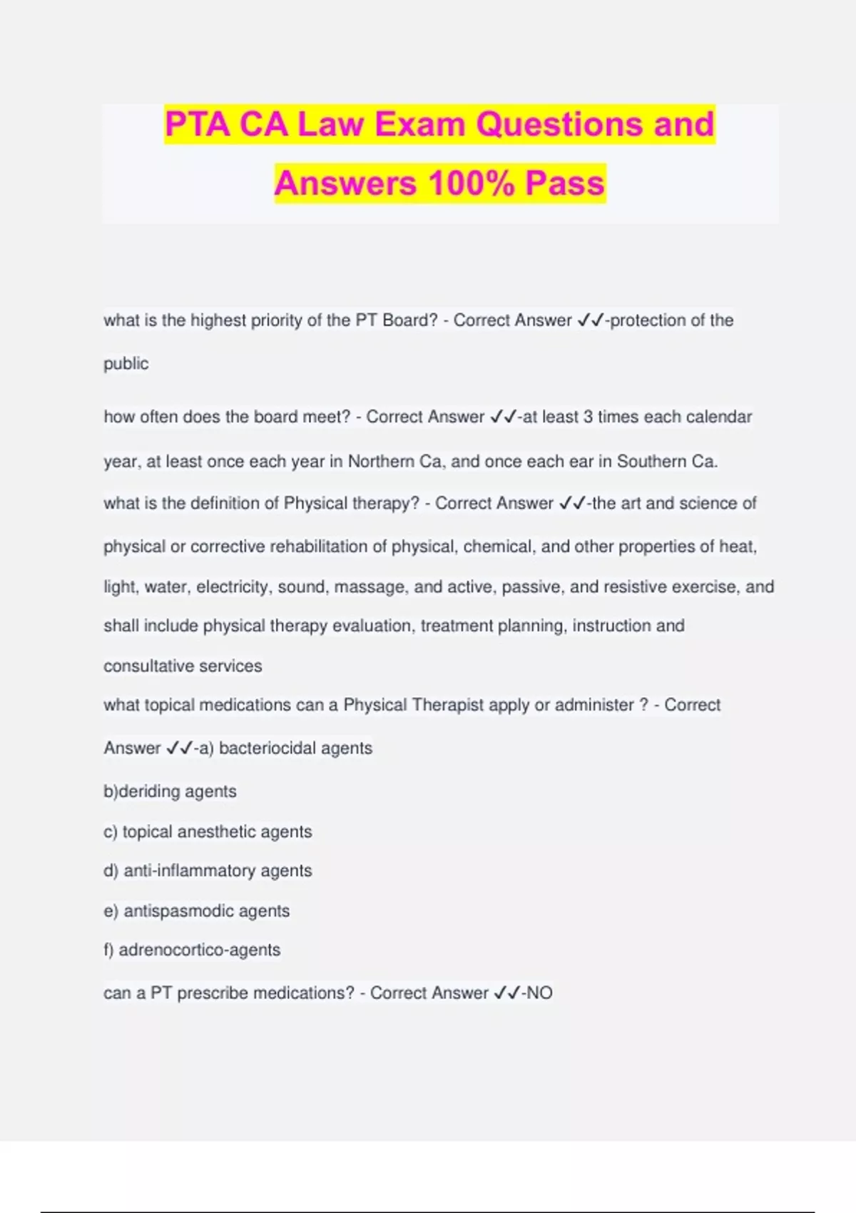 PTA CA Law Exam Questions and Answers 100% Pass what is the highest priority of the PT Board? - Correct Answer ️️ -protection of the public how often does the board meet? - Correct Answer ️️ -at least 3 times each calendar year, at least once each year in Northern Ca, and once each ear in Southern Ca. what is the definition of Physical therapy? - Correct Answer ️️ -the art and science of physical or corrective rehabilitation of physical, chemical, and other properties of heat, light, water, electricity, sound, massage, and active, passive, and resistive exercise, and shall include physical therapy evaluation, treatment planning, instruction and consultative services what topical medications can a Physical Therapist apply or administer ? - Correct Answer ️️ -a) bacteriocidal agents b)deriding agents c) topical anesthetic agents d) anti-inflammatory agents e) antispasmodic agents f) adrenocortico-agents can a PT prescribe medications? - Correct Answer ️️ -NO What are the parameters of a physical therapist performing tissue penetration? - Correct Answer ️️ -upon specified authorization of a physician and surgeon, PT can perform tissue penetration for the purpose of evaluating neuromuscular performance as long as the physician therapist does not develop or make diagnostic or prognostic interpretations of the data obtained. how long should patient records be maintained? - Correct Answer ️️ -for no less than 7 years following the discharge of the patient, except for the records of unemancipated minors which shall be maintained at least one year after the minor has reached 18 years of age, and not in any case less than seven years PT supervision of PTA (ratio) - Correct Answer ️️ -PT shal not supervise more than 2 PTA at one time PT use of Aide (supervision) - Correct Answer ️️ -Pt may utilize the services of one aide engaged in patient related tasks. Shall at all times be under orders, direction, and continuous and immediate supervision of the PT. continuous and immediate supervision - Correct Answer ️️ -the PT shall be in the same facility as, and in proximity to, the location where the aide is performing patient- related tasks, and shall be readily available at all times to provide advice or instruction Patient related tasks - Correct Answer ️️ -a physical therapy service rendered directly to the patient by an aide. The administration of massage, external baths, or normal exercise not a part of a PT treatment shall not be prohibited