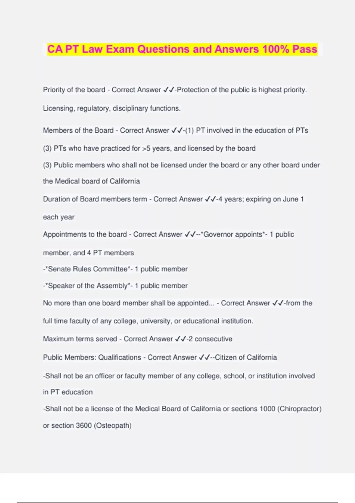 CA PT Law Exam Questions and Answers 100% Pass Priority of the board - Correct Answer ️️ -Protection of the public is highest priority. Licensing, regulatory, disciplinary functions. Members of the Board - Correct Answer ️️ -(1) PT involved in the education of PTs (3) PTs who have practiced for >5 years, and licensed by the board (3) Public members who shall not be licensed under the board or any other board under the Medical board of California Duration of Board members term - Correct Answer ️️ -4 years; expiring on June 1 each year Appointments to the board - Correct Answer ️️ --*Governor appoints*- 1 public member, and 4 PT members -*Senate Rules Committee*- 1 public member -*Speaker of the Assembly*- 1 public member No more than one board member shall be appointed... - Correct Answer ️️ -from the full time faculty of any college, university, or educational institution. Maximum terms served - Correct Answer ️️ -2 consecutive Public Members: Qualifications - Correct Answer ️️ --Citizen of California -Shall not be an officer or faculty member of any college, school, or institution involved in PT education -Shall not be a license of the Medical Board of California or sections 1000 (Chiropractor) or section 3600 (Osteopath) Compensation - Correct Answer ️️ -provided per diem and compensations per section 103 ($100/day of duties and travel and expenses incurred while performing official duties) Board Employees - Correct Answer ️️ --Clerical assistants and other employees it may deem necessary to carry out its powers and duties. Except sections 159.5 (Health Quality Investigation Unit) -PT consultants to assist with programs and on an intermittent basis Inspections - Correct Answer ️️ -Any member of the board or any licensed PT appointed by the board may inspect or require reports from a general or specialized hospital or other facility providing PT care, treatment, services and the staff. May inspect patient records with respect to care, treatment, services, or facilities. Suspension and Revocation of Licenses - Correct Answer ️️ -The board shall issue, suspend, and revoke licenses and approvals to practice PT. Meetings - Correct Answer ️️ -At least 1 regular meeting annually in Sacramento, Los Angeles, and San Francisco. Special meeting may be held at any time and place the board may designate. Meeting Notice - Correct Answer ️️ -Must publicly notice their meetings, prepare agendas, accept public testimony and conduct their meetings in public unless specifically authorized to meet in closed session. Commissioner on Examination - Correct Answer ️️ -Board may appoint. Does not need to be a member of the board, but subject to the same rules and regulations and entitled to the same fees as members. Hearings - Correct Answer ️️ --Shall hear all matters including any contested case or petition for reinstatement, restoration, or modification of probation. -If a contested case is presented to the board the hearing officer will be present during the board's consideration and shall assist in advising the board if requested. - At the conclusion the board will deny and application for, or suspend, or revoke, or impose probation conditions upon, a license or approval. Physical Therapy definition - Correct Answer ️️ -- The art and science of physical or corrective rehabilitation or of physical or corrective treatment of any bodily or mental condition any person by the use of physical, chemical, and other properties of heat, light, water, electricity, sound, massage and active , passive, and resistive exercise, and consultative service. The practice of PT includes... - Correct Answer ️️ -The promotion and maintenance of physical fitness to enhance the bodily movement related health and wellness of individuals through the use of physical therapy interventions. Not authorized under the term "Physical Therapy"... - Correct Answer ️️ -The use of roentgen rays and radioactive materials, for diagnostic and therapeutic purposes, and the use of electricity for surgical purposes, including cauterization. A license issued by this chapter does not authorize the diagnosis of disease. Topical Medications - Correct Answer ️️ -- A PT may apply topical medications if he/she complies with regulations adopted by the board. Nothing in this sections authorizes PTs to prescribe medications. Certification to Penetrate Tissues for the Purposes of Neuromuscular Evaluation - Correct Answer ️️ -a PT may, upon specified authorization from a surgeon perform