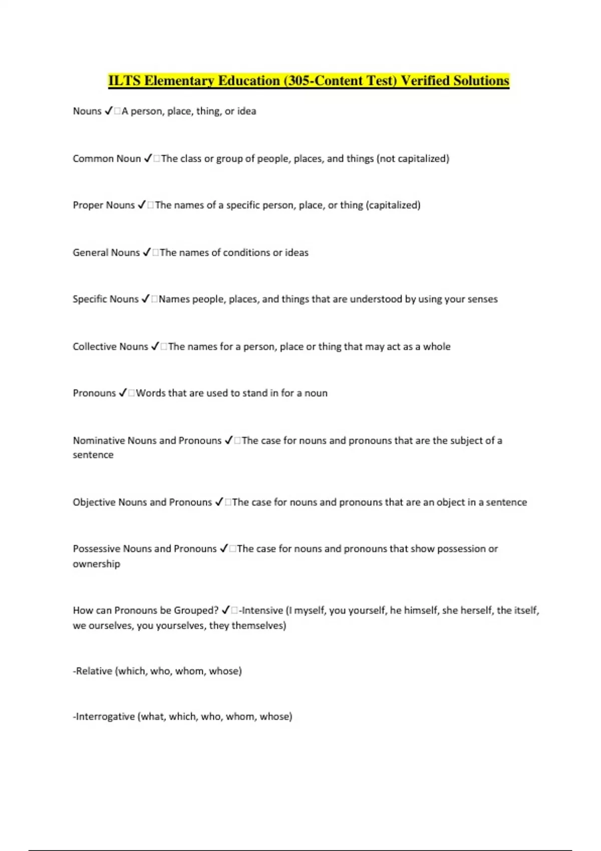 ILTS Elementary Education (305-Content Test) Verified Solutions Nouns ️A person, place, thing, or idea Common Noun ️The class or group of people, places, and things (not capitalized) Proper Nouns ️The names of a specific person, place, or thing (capitalized) General Nouns ️The names of conditions or ideas Specific Nouns ️Names people, places, and things that are understood by using your senses Collective Nouns ️The names for a person, place or thing that may act as a whole Pronouns ️Words that are used to stand in for a noun Nominative Nouns and Pronouns ️The case for nouns and pronouns that are the subject of a sentence Objective Nouns and Pronouns ️The case for nouns and pronouns that are an object in a sentence Possessive Nouns and Pronouns ️The case for nouns and pronouns that show possession or ownership How can Pronouns be Grouped? ️-Intensive (I myself, you yourself, he himself, she herself, the itself, we ourselves, you yourselves, they themselves) -Relative (which, who, whom, whose) -Interrogative (what, which, who, whom, whose) -Demonstrative (this, that, these, those) -Indefinite (all, any, each, everyone, either/neither, one, some, several) -Reciprocal (each other, one another) Transitive Verbs ️A verb whose action points to a receiver Intransitive Verbs ️A verb that does not point to a receiver of an action Action Verbs ️A verb that shows what subject is doing in a sentence Linking Verbs ️Link the subject of a sentence to a noun or pronoun or link a subject with an adjective Transitive Verbs-Active Voice ️The subject of the sentence is doing the action Transitive Verbs-Passive Voice ️The subject receives the action Past Verbs ️The action happened in the past Present Verbs ️The action happens at the current time Future Verbs ️The action is going to happen later Past Perfect Verbs ️The second action started in the past and the first action came before the second Present Perfect Verbs ️The action started in the past and continues int