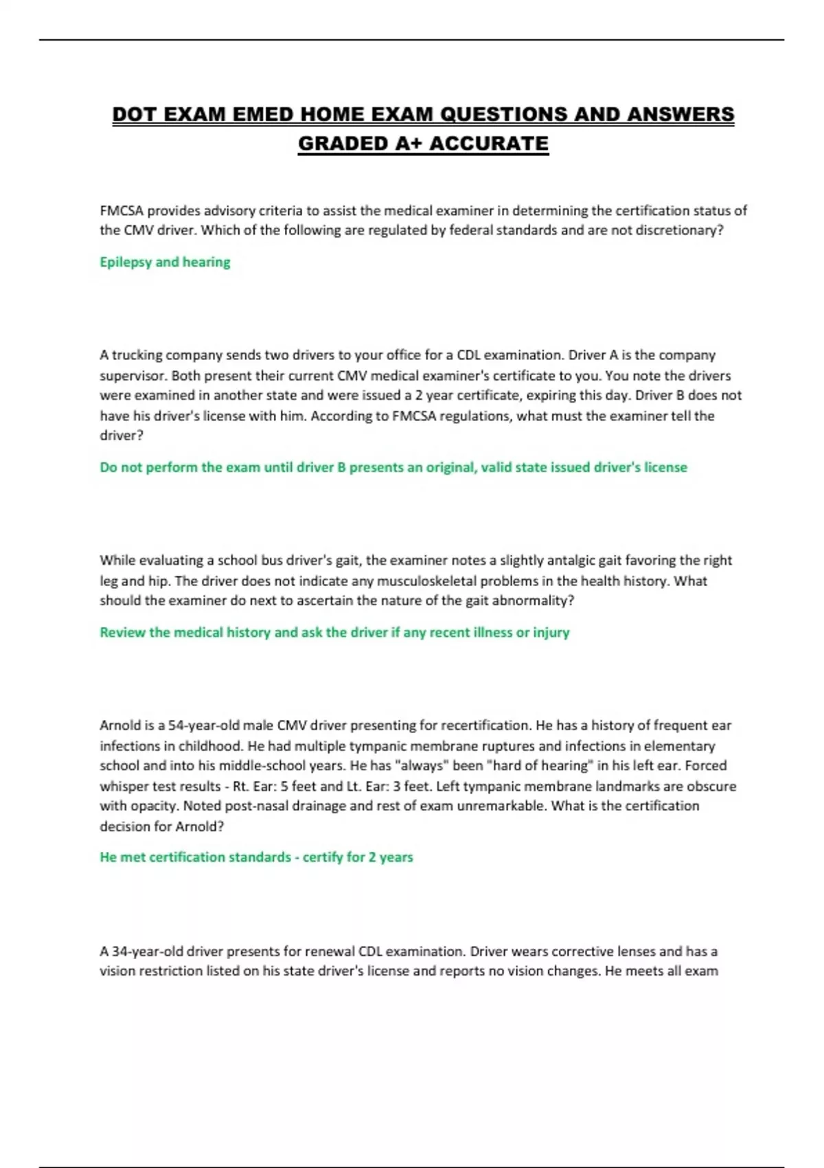 DOT EXAM EMED HOME EXAM QUESTIONS AND ANSWERS GRADED A+ ACCURATE DOT EXAM EMED HOME EXAM QUESTIONS AND ANSWERS GRADED A+ ACCURATE DOT EXAM EMED HOME EXAM QUESTIONS AND ANSWERS GRADED A+ ACCURATE