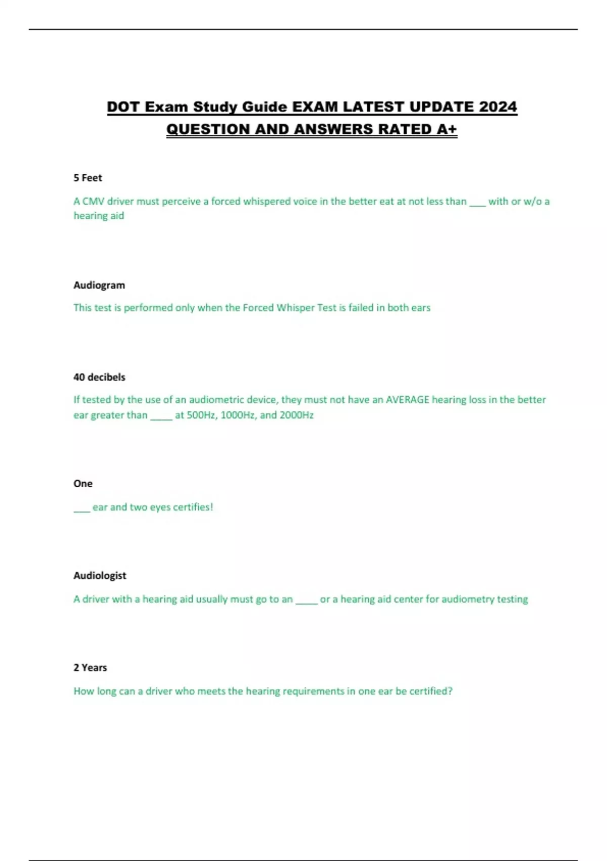DOT Exam Study Guide EXAM LATEST UPDATE 2024 QUESTION AND ANSWERS RATED A+