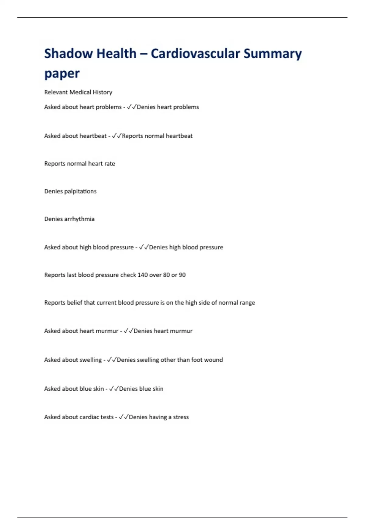 Shadow Health – Cardiovascular Summary paper
