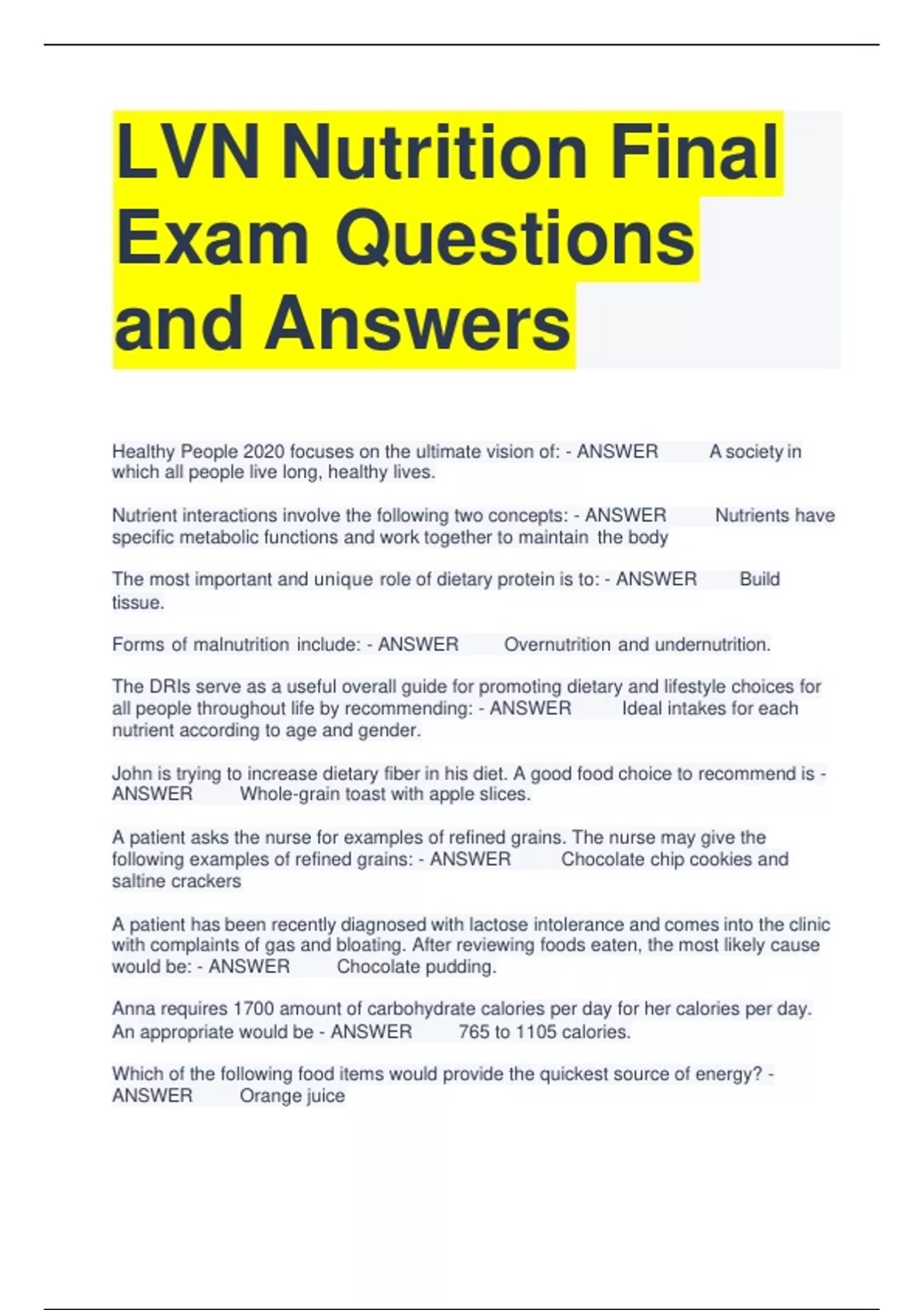 LVN Nutrition Final Exam Questions and Answers Healthy People 2020 focuses on the ultimate vision of: - ANSWER A society in which all people live long, healthy lives. Nutrient interactions involve the following two concepts: - ANSWER Nutrients have specific metabolic functions and work together to maintain the body The most important and unique role of dietary protein is to: - ANSWER Build tissue. Forms of malnutrition include: - ANSWER Overnutrition and undernutrition. The DRIs serve as a useful overall guide for promoting dietary and lifestyle choices for all people throughout life by recommending: - ANSWER Ideal intakes for each nutrient according to age and gender. John is trying to increase dietary fiber in his diet. A good food choice to recommend is - ANSWER Whole-grain toast with apple slices. A patient asks the nurse for examples of refined grains. The nurse may give the following examples of refined grains: - ANSWER Chocolate chip cookies and saltine crackers A patient has been recently diagnosed with lactose intolerance and comes into the clinic with complaints of gas and bloating. After reviewing foods eaten, the most likely cause would be: - ANSWER Chocolate pudding. Anna requires 1700 amount of carbohydrate calories per day for her calories per day. An appropriate would be - ANSWER 765 to 1105 calories. Which of the following food items would provide the quickest source of energy? - ANSWER Orange juice Margaret has been reading information from the Internet regarding the health benefits of coconut oil in the diet. It is important for Margaret to know that coconut oil contains what type of fat? - ANSWER Saturated Elevated levels of blood fats are referred to as: - ANSWER Hyperlipidemia. A patient has been advised to follow a low saturated fat diet to help reduce the risk of heart disease. Which of the following foods would most likely be recommended as part of this meal plan? - ANSWER Skinless chicken and vegetables sautéed with olive oill Jeremy consumed 1800 calories of which 50 grams were from fat. What percent of calories are provided from fat? - ANSWER 25 Bile from the gallbladder serves as a (an) rather than an enzyme in the chemical digestive process. - ANSWER Emulsifier carbohydrates and fats because of the structure. - ANSWER Nitrogen Complete proteins can be found in which food source? - ANSWER Eggs A substitution to recommend to a patient who is vegan and wants to make a recipe that calls for whole cow's milk would be: - ANSWER Soy milk. Protein requirements would be the highest for which of the following individual s? - ANSWER 16-year-old teenager A state of negative nitrogen balance is most likely found in which of the following? - ANSWER A 32 year old on bed rest following severe trauma If you chew a piece of bread in the mouth for a long time, it begins to taste sweet because of the action of the enzyme: - ANSWER Amylase. An example of mechanical digestion is: - ANSWER Mastication A 45 - year - old female is considering eating 2 1/2 times the recommended protein for her body in order to build more lean muscle. What would you suggest? - ANSWER Explain to her that excess protein intake is broken down and used for energy if needed or stored as fat. A patient who has a large surgical resection of the small intestine would most likely have difficulty with: - ANSWER Digesting food. Which of the following individuals most likely has the highest energy needs per unit of body weight? - ANSWER 7-month-old baby boy Which of the following serves to maintain normal blood glucose levels during sleep hours? - ANSWER Glycogen stores A measure of a patient's metabolic rate could be determined using: - ANSWER Indirect calorimetry. Jenny is trying to lose weight and has decreased her energy intake by 250 kcal per day. How long should it take her to lose 1 lb of body fat? - ANSWER Approximately 14 days Calculate the amount of calories in 1 cup of milk that contains 4 grams of fat, 10 grams of protein, and 15 grams of carbohydrate. - ANSWER 136 kcal Mary wants to increase her intake of foods rich in ß-carotene. Which of the following foods would be the best source? - ANSWER Spinach