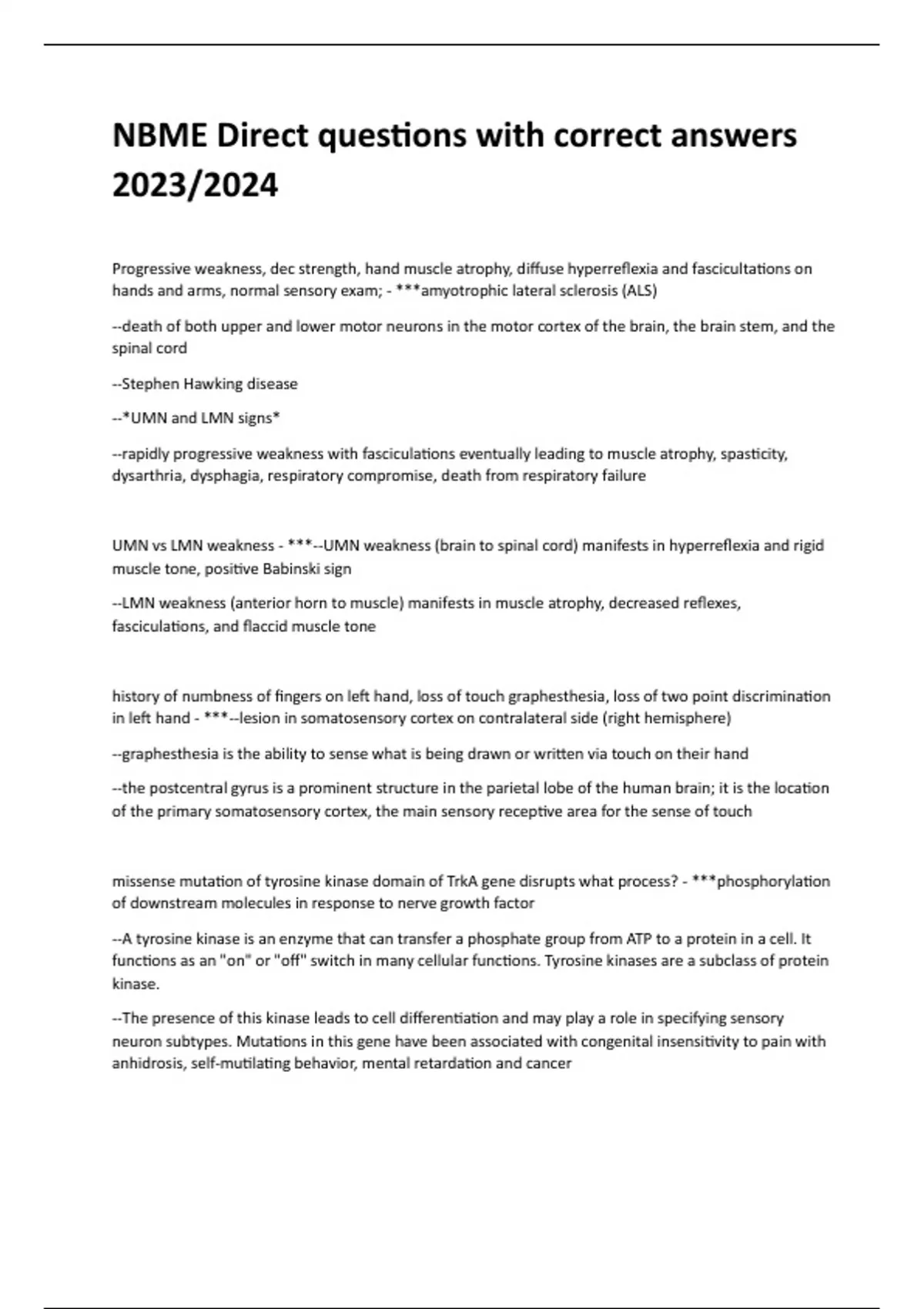Progressive weakness, dec strength, hand muscle atrophy, diffuse hyperreflexia and fascicultations on hands and arms, normal sensory exam; - ***amyotrophic lateral sclerosis (ALS) --death of both upper and lower motor neurons in the motor cortex of the brain, the brain stem, and the spinal cord --Stephen Hawking disease --*UMN and LMN signs* --rapidly progressive weakness with fasciculations eventually leading to muscle atrophy, spasticity, dysarthria, dysphagia, respiratory compromise, death from respiratory failure UMN vs LMN weakness - ***--UMN weakness (brain to spinal cord) manifests in hyperreflexia and rigid muscle tone, positive Babinski sign --LMN weakness (anterior horn to muscle) manifests in muscle atrophy, decreased reflexes, fasciculations, and flaccid muscle tone history of numbness of fingers on left hand, loss of touch graphesthesia, loss of two point discrimination in left hand - ***--lesion in somatosensory cortex on contralateral side (right hemisphere) --graphesthesia is the ability to sense what is being drawn or written via touch on their hand --the postcentral gyrus is a prominent structure in the parietal lobe of the human brain; it is the location of the primary somatosensory cortex, the main sensory receptive area for the sense of touch missense mutation of tyrosine kinase domain of TrkA gene disrupts what process? - ***phosphorylation of downstream molecules in response to nerve growth factor --A tyrosine kinase is an enzyme that can transfer a phosphate group from ATP to a protein in a cell. It functions as an "on" or "off" switch in many cellular functions. Tyrosine kinases are a subclass of protein kinase. --The presence of this kinase leads to cell differentiation and may play a role in specifying sensory neuron subtypes. Mutations in this gene have been associated with congenital insensitivity to pain with anhidrosis, self-mutilating behavior, mental retardation and cancer this part of the brain is affected most in chronic alcoholics - ***--anterior vermis --a lesion in the vermis causes truncal ataxia, gait ataxia, and dysarthria suppression vs. repression - ***suppression: mature defense suppression is the voluntary withholding of an idea of feeling from conscious awareness, like not thinking about an exam until the week of it or doctor controlling anger at alcoholic pts he doesnt like repression: immature defense repression is someone involuntarily withholding something from consciousness like not remembering going to counseling for parents divorce reaction formation - ***replace a bad/warded off feeling/idea with an emphasis on its opposite; someone with libidinous thoughts enters a monastery sublimation - ***mature reaction formation; replacing unacceptable wish with action similar to wish but does not conflict with their values, like teens aggression toward father redirected to perform well in sports elderly woman with 1mo hx of urinary frequency and urgency, 3mo hx of walking difficulty, problems with conversation and memory; normal strength and sensation; mini cog average-normal; wide shuffling gait; ct shows enlarged ventricles - ***normal pressure hydrocephalus --*wet, wobbly, wacky* triad of urinary incontinence, ataxia, cognitive dysfunction --expands ventricles that distort fibers of the corona radiata that lead to dementia, ataxia, urinary incontinence --does not increase subarachnoid space volume --common in elderly and idiopathic IHC positive for chromogranin indicates cancer of what origin? - ***neuroendocrine or carcinoid 10% of pheochromocytomas are extraadrenal, occurring i