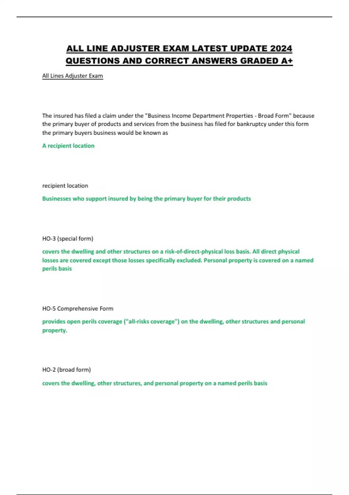 ALL LINE ADJUSTER EXAM LATEST UPDATE 2024 QUESTIONS AND CORRECT ANSWERS GRADED A+ ALL LINE ADJUSTER EXAM LATEST UPDATE 2024 QUESTIONS AND CORRECT ANSWERS GRADED A+