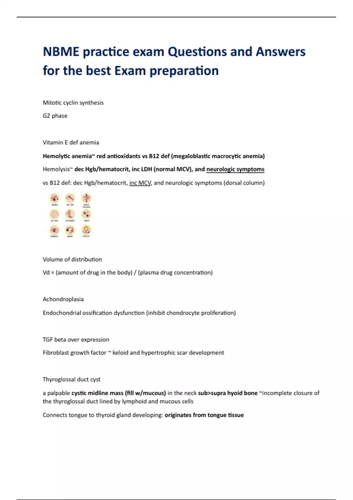 Mitotic cyclin synthesis G2 phase Vitamin E def anemia Hemolytic anemia~ red antioxidants vs B12 def (megaloblastic macrocytic anemia) Hemolysis~ dec Hgb/hematocrit, inc LDH (normal MCV), and neurologic symptoms vs B12 def: dec Hgb/hematocrit, inc MCV, and neurologic symptoms (dorsal column) Volume of distribution Vd = (amount of drug in the body) / (plasma drug concentration) Achondroplasia Endochondrial ossification dysfunction (inhibit chondrocyte proliferation) TGF beta over expression Fibroblast growth factor ~ keloid and hypertrophic scar development Thyroglossal duct cyst a palpable cystic midline mass (fill w/mucous) in the neck sub>supra hyoid bone ~incomplete closure of the thyroglossal duct lined by lymphoid and mucous cells Connects tongue to thyroid gland developing: originates from tongue tissue Doesn't close completely-> cyst (fill w/mucous) -enlarge in infections, inc mucous, form thyroid cancer via ectopic thyroid tissue Moves w/tongue mvmt Immunoreactive trypsinogen (IRT) Measurement in blood of newborn babies is an assay in rapidly increasing use as a screening test for cystic fibrosis Positive~ CF (2 mutations- AR to cause CF phenotype) Mullerian agenesis (Mayer-Rokitansky-Kuster-Hauser syndrome) vs androgen insensitivity Both present w/blind vaginal pouch and absent 1st menstrual period AI: XY w/absent hair development (inc tesoterone-> estrogen production and female characteristics) MIF still made in embryo, also may be very tall~ lack of androgen mediated growth plate closure MA: XX w/NORMAL hair development suspensory ligament of ovary Ligament that contains ovarian vessels -posterior to ligament~ ureter Oophorectomy: divides suspensory ligament~ risk of ovarian vessel of ureter damage Ureter: also runs behind the uterine artery (F) and vas deferens (M) near its entrance to the bladder delirium tremens (DTs) the dramatic physical and psychological effects of alcohol withdrawal -> autonomic instability~ hypokalemia (catecholamine mediated intracellular shifts of K+ via inc Na/K+ ATPase activity)-> arrythmias Beneficence weighing risks and costs of procedure against the benefits of treat ment vs nonmaleficence: avoiding the causation of harm Zellweger syndrome Peroxisomal disease can't metabolize very long chain FA (VLCFAs) or branched-chain FAs (e.g. phytanic acid, via alphaoxidation) Serum: high bilirubin, AST/ALT and VLFAs**