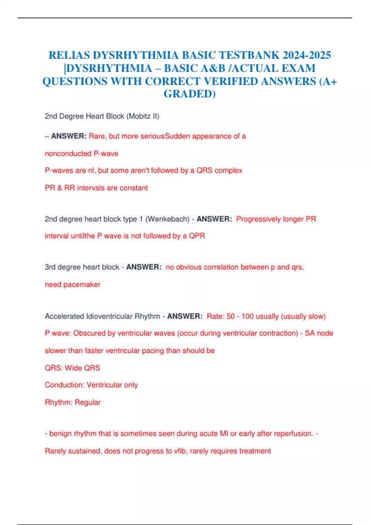 RELIAS DYSRHYTHMIA BASIC TESTBANK |DYSRHYTHMIA – BASIC A&B /ACTUAL EXAM QUESTIONS WITH CORRECT VERIFIED ANSWERS (A+ GRADED)