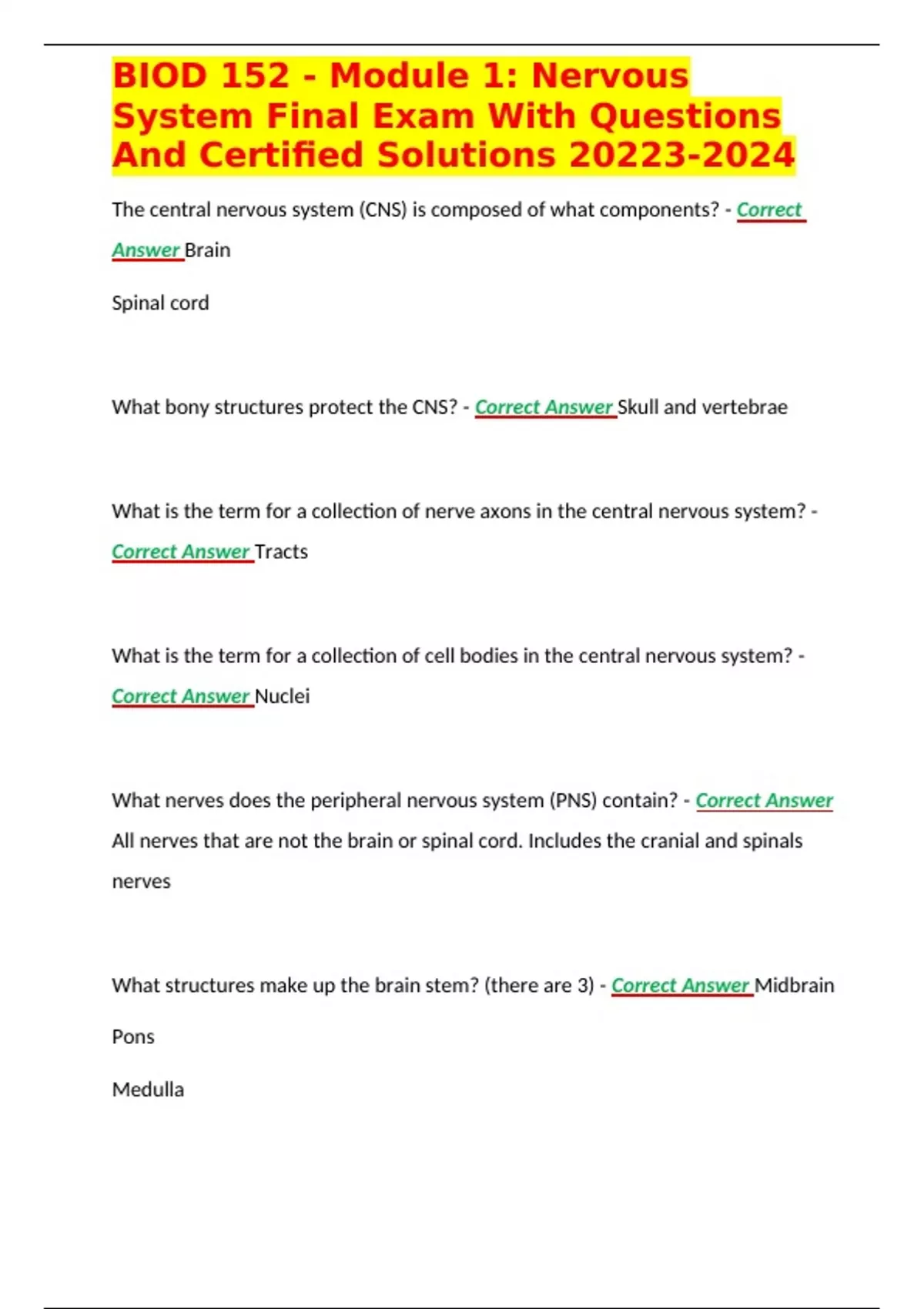BIOD 152 - Module 1: Nervous System Final Exam With Questions And Certified Solutions