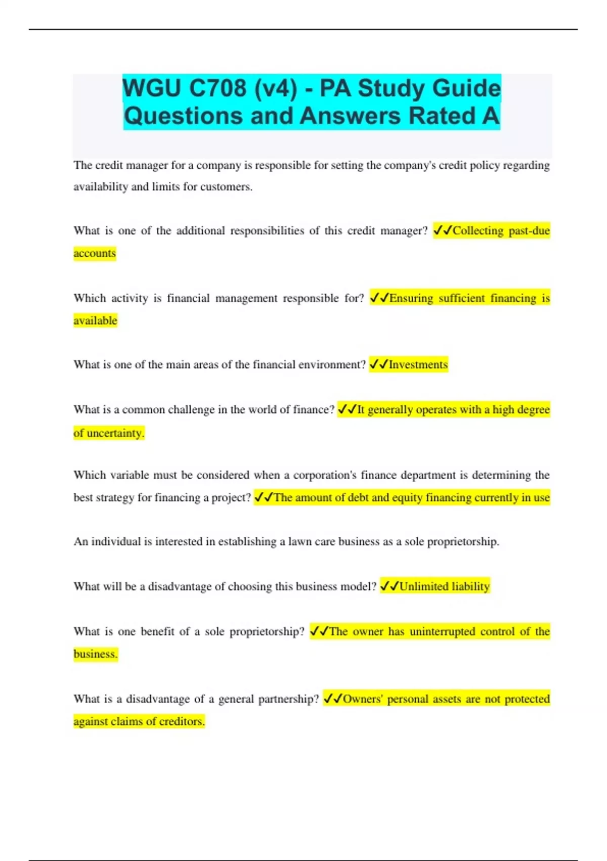 WGU C708 (v4) - PA Study Guide Questions and Answers Rated A The credit manager for a company is responsible for setting the company's credit policy regarding availability and limits for customers. What is one of the additional responsibilities of this credit manager? Collecting past-due accounts Which activity is financial management responsible for? Ensuring sufficient financing is available What is one of the main areas of the financial environment? Investments What is a common challenge in the world of finance? It generally operates with a high degree of uncertainty. Which variable must be considered when a corporation's finance department is determining the best strategy for financing a project? The amount of debt and equity financing currently in use An individual is interested in establishing a lawn care business as a sole proprietorship. What will be a disadvantage of choosing this business model? Unlimited liability What is one benefit of a sole proprietorship? The owner has uninterrupted control of the business. What is a disadvantage of a general partnership? Owners' personal assets are not protected against claims of creditors.What is one advantage of an LLC? Limited personal liability What is an example of a potential principal-agent problem? Corporate executives buying other companies to expand their influence An individual decides to sell corporate bonds to another investor. Which type of financial market or institution would be involved in this transaction? Retail securities firm A firm wants to sell new shares of stock. Which other institution is involved in this type of transaction? Investment banking firm A partnership needs funds to purchase technology equipment. It will be able to repay those funds in under a year's time. Which organization should the partnership contact to obtain the needed funds? Retail bank Which type of transactions do financial institutions deal with? Deposits What is considered a financial institution? Commercial bank Which situation is unethical? The investment manager publishes false investment performance reports in hopes of convincing new investors to invest money. Which type of financial statement is used to determine the short-term viability of a company? Statement of cash flows Which are components of an income statement? Revenue and expensesWhich statement describes the historical cost principle? Most assets are valued at their original cost when acquired by a company.