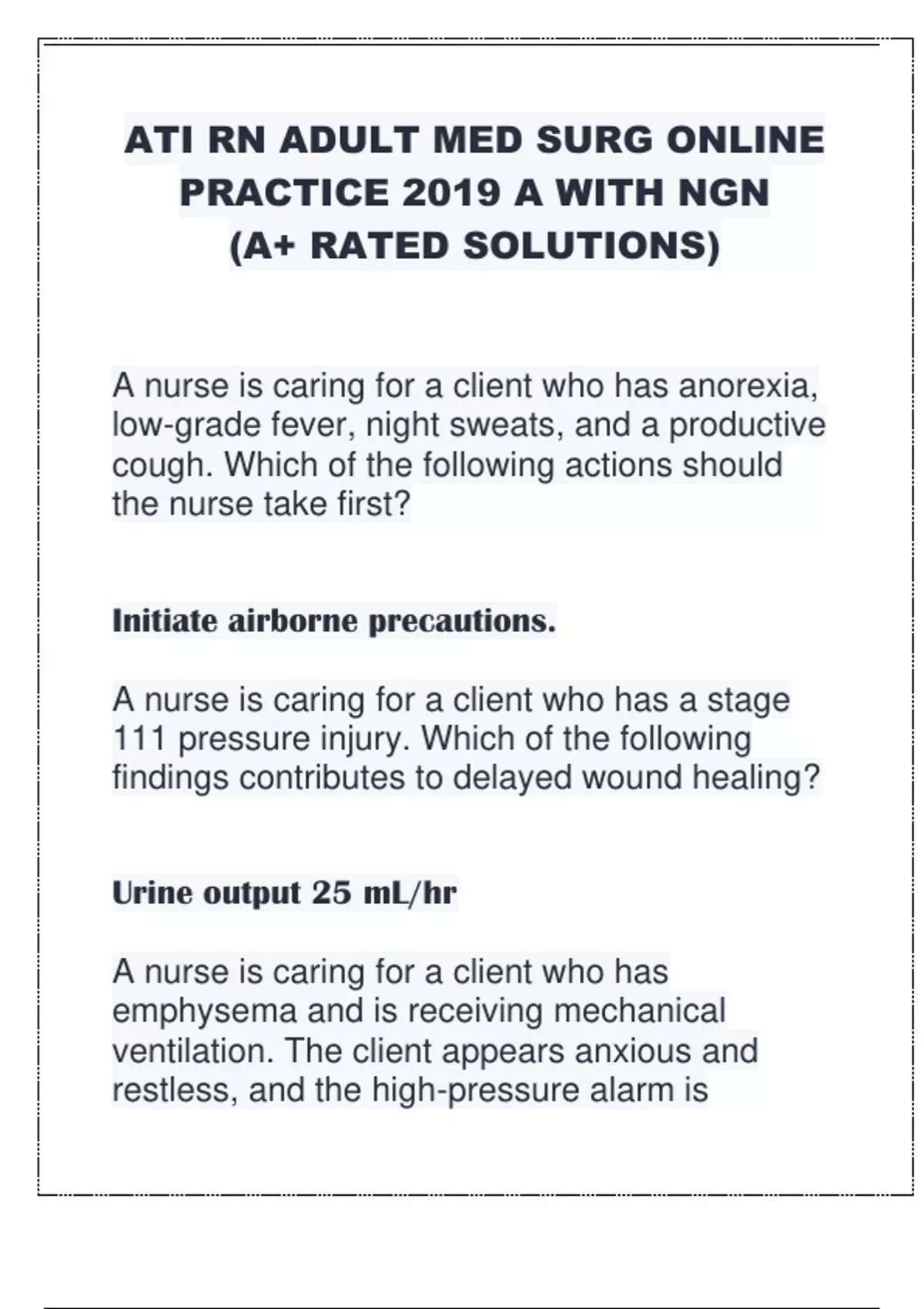 ATI RN ADULT MED SURG ONLINE PRACTICE 2019 A WITH NGN (A+ RATED SOLUTIONS) A nurse is caring for a client who has anorexia, low-grade fever, night sweats, and a productive cough. Which of the following actions should the nurse take first? Initiate airborne precautions. A nurse is caring for a client who has a stage 111 pressure injury. Which of the following findings contributes to delayed wound healing? Urine output 25 mL/hr A nurse is caring for a client who has emphysema and is receiving mechanical ventilation. The client appears anxious and restless, and the high-pressure alarm is sounding. Which of the following actions should the nurse take first? Instruct the client to allow the machine to breathe for them. A nurse is caring for a client who has hepatic encephalopathy that is being treated withy lactulose. The client is experiencing excessive stools. Which of the following findings is an adverse effect of this medication? Hypokalemia A nurse in an emergency department is caring for a client who reports vomiting and diarrhea for the past 3 days. Which of the following findings should indicate to the nurse that the client is experiencing fluid volume deficit? Heart rate 110/min A nurse is caring for a client who has pancreatitis. The nurse should expect which of the following laboratory results to be below the expected reference range? Calcium A nurse is assessing a client who has Graces' disease. Which of the following images should indicate to the nurse that the client has exophthalmos? Eyes bulging out of head. A nurse is caring for a client who was just admitted from the emergency department (ED). 0945: Client is experiencing a sickle cell crisis. 1200: Client is sitting up in high-Fowler's position and appears anxious. Client reports shortness of breath and severe chest pain as 9 on a scale of 0 to 10. Client states that they have started coughing and are expectorating pink-tinged mucus. Lung sounds with increased wheezing in left lung and clear on the right side. Equal chest expansion noted. The client is most likely experiencing Acute chest syndrome and pneumonia. A nurse in an acute care facility is caring for a client who is at risk for seizures. Which of the following precautions should the nurse implement? Ensure the client has a patent IV. A nurse is ass4ess9ing a client who has had a plaster cast applied to their left leg 2 hr ago. Which of the following actions should the nurse take? Check that one finger fits between the cast and the leg. A nurse is caring for a client 1 hr following a cardiac catheterization. The nurse notes the formation of a hematoma at the insertion site and a decreased pulse rate in the affected extremity. Which of the following interventions is the nurse's priority? Apply firm pressure to the insertion site A nurse is assessing a male client for an inguinal hernia. Which of the following areas should the nurse palpate to verify that the client has an inguinal hernia? Upper groin A nurse is assessing a client who has acute cholecystitis. Which of the following findings is the nurse's priority? Tachycardia