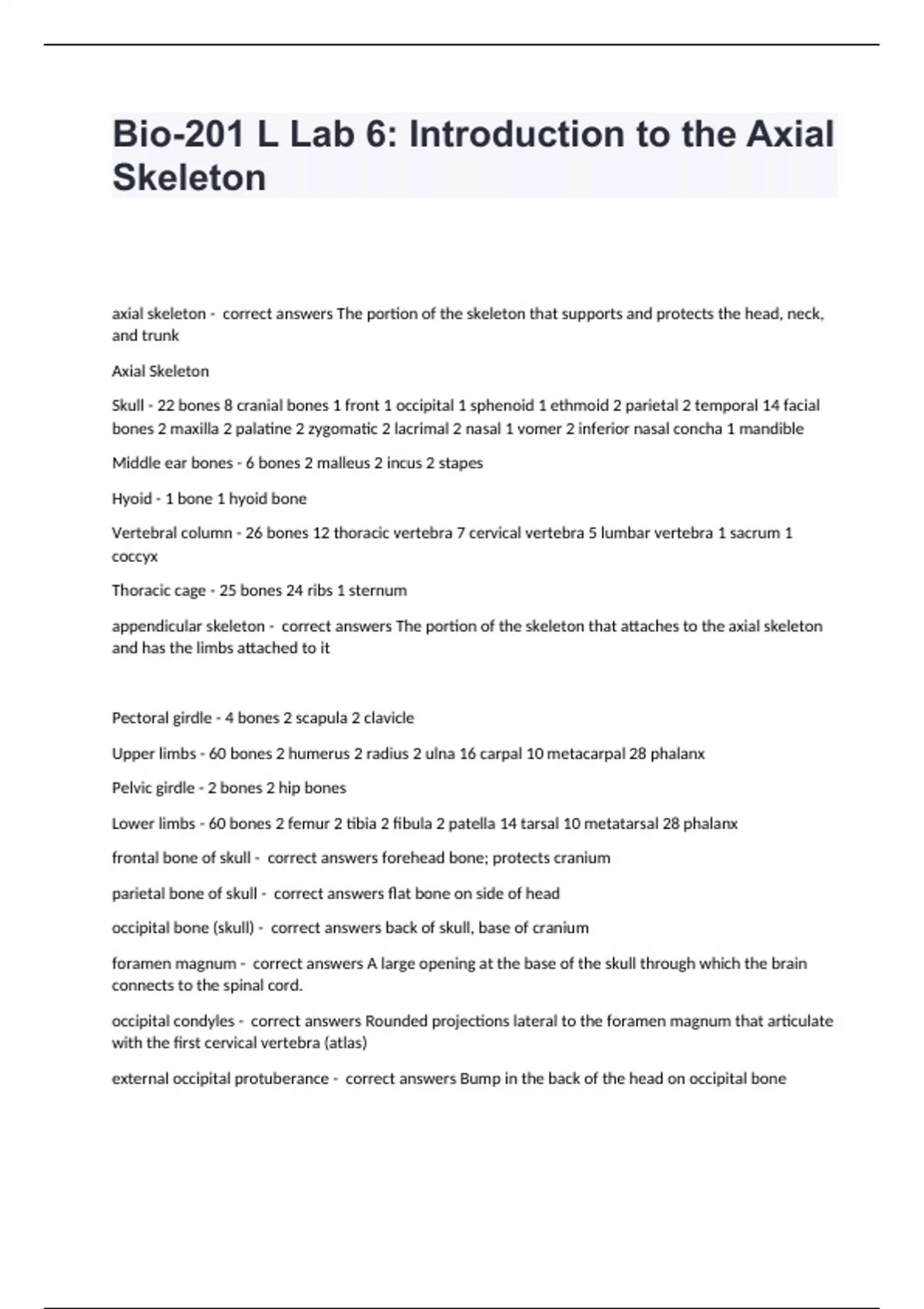 Bio-201 L Lab 6: Introduction to the Axial Skeleton correct VERIFIED ANSWERS