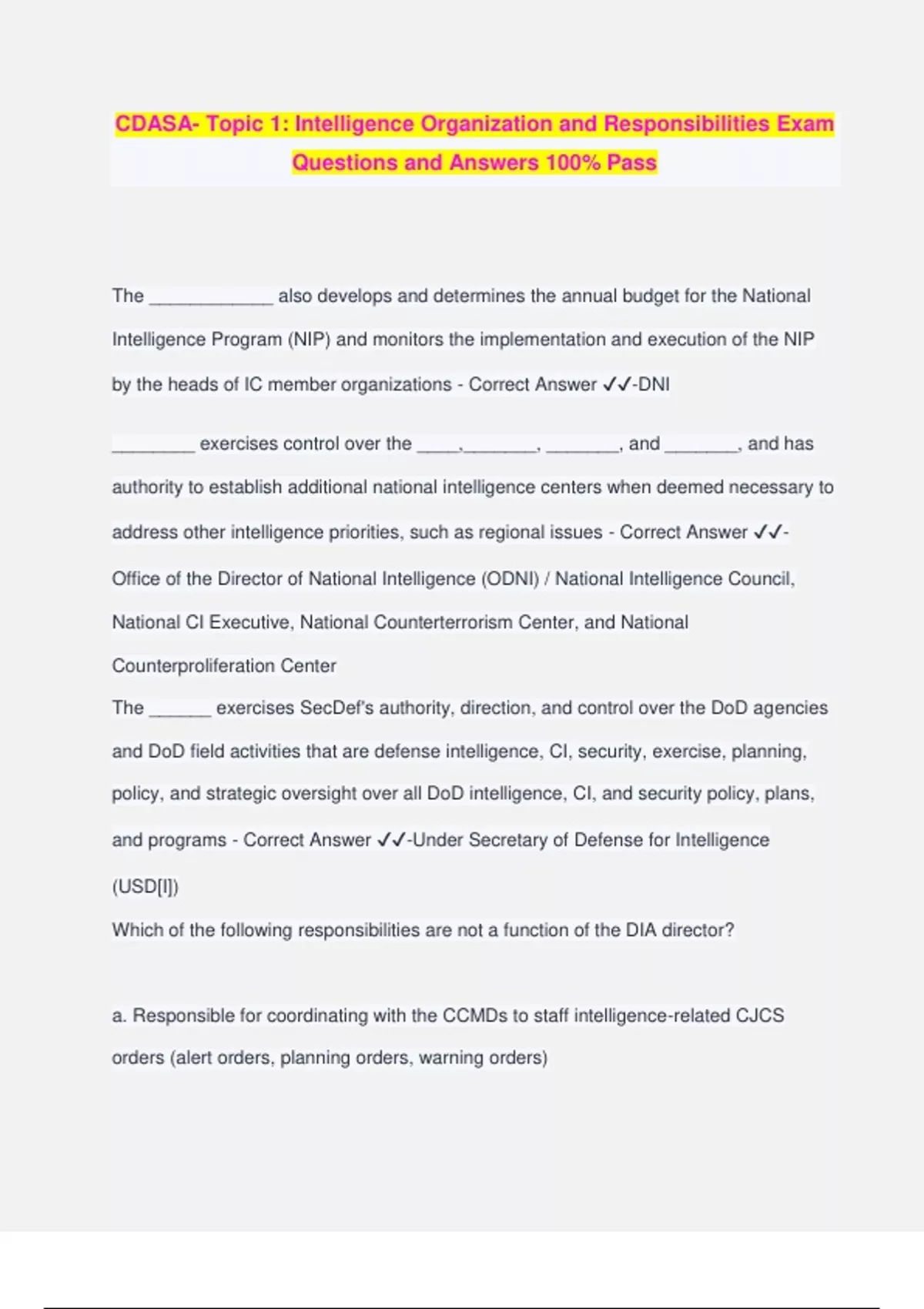 CDASA- Topic 1: Intelligence Organization and Responsibilities Exam Questions and Answers 100% Pass The ____________ also develops and determines the annual budget for the National Intelligence Program (NIP) and monitors the implementation and execution of the NIP by the heads of IC member organizations - Correct Answer ️️ -DNI ________ exercises control over the ____,_______, _______, and _______, and has authority to establish additional national intelligence centers when deemed necessary to address other intelligence priorities, such as regional issues - Correct Answer ️️ - Office of the Director of National Intelligence (ODNI) / National Intelligence Council, National CI Executive, National Counterterrorism Center, and National Counterproliferation Center The ______ exercises SecDef's authority, direction, and control over the DoD agencies and DoD field activities that are defense intelligence, CI, security, exercise, planning, policy, and strategic oversight over all DoD intelligence, CI, and security policy, plans, and programs - Correct Answer ️️ -Under Secretary of Defense for Intelligence (USD[I]) Which of the following responsibilities are not a function of the DIA director? a. Responsible for coordinating with the CCMDs to staff intelligence-related CJCS orders (alert orders, planning orders, warning orders) b. Coordinates intelligence support to meet CCMD requirements and reports to SecDef through the Joint Chiefs of Staff (JCS) c. Defense Collections, CI, and HUMINT manager d. Commander, joint functional component command for intelligence, surveillance, and reconnaissance (JFCC-ISR) e. Supports activities to leverage joint reserve intelligence centers (JRICs) - Correct Answer ️️ -A - NOT Responsible for coordinating with the CCMDs to staff intelligence- related CJCS orders (alert orders, planning orders, warning orders) The DIA Director is also responsible for representing and advocating CCMD views and intelligence requirements to the Joint Staff and Office of the Secretary of Defense (OSD). a. True b. False - Correct Answer ️️ -B. False The Joint Staff J-2 is responsible The _____ exercises staff supervision of the intelligence alert center supporting the NMCC and keeps the CJCS apprised of foreign situations that are relevant to current and potential national security policy, objectives, and strategy. - Correct Answer ️️ - The Joint Staff Directorate for Intelligence, J-2, ______ , ________ , and ______ and______ provide intelligence and CI support for departmental missions related to military systems, equipment, and training. - Correct Answer ️️ -The Service Chiefs, their intelligence and CI chiefs, and staffs The military members of the IC consist of the _______ defense agencies and the _____________________________ - Correct Answer ️️ -four ; four Service intelligence organizations The _________ assists the USD(I) with respect to matters relating to the integration of ISR capabilities and the coordination of related developmental activities of DOD components and CCMDs. - Correct Answer ️️ -ISR Integration Council In addition to the J-2 staffs at every joint level of command, the key organizations in the defense intelligence architecture are the __________, ___________, ____________, and the _____________ - Correct Answer ️️ -CCMD JIOCs, the JTF joint intelligence support elements (JISEs), JFCC-ISR, and the JRICs