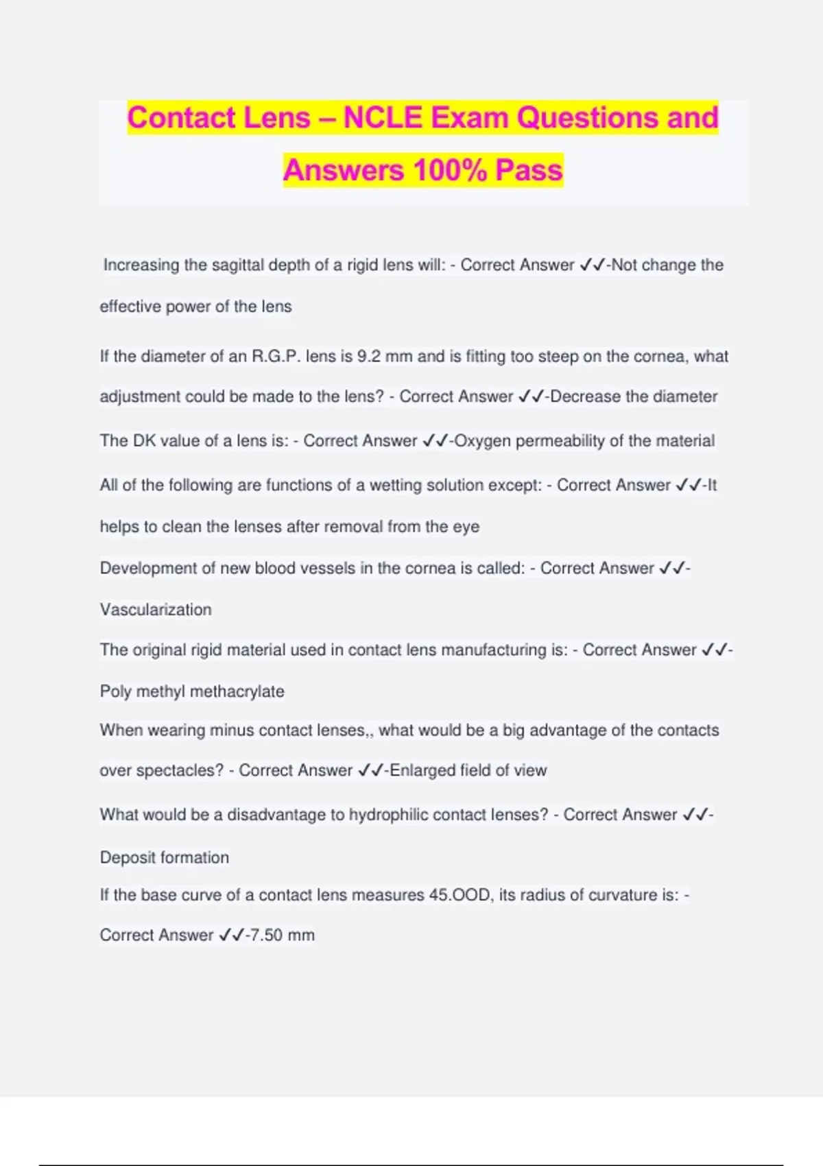 Contact Lens – NCLE Exam Questions and Answers 100% Pass Increasing the sagittal depth of a rigid lens will: - Correct Answer ️️ -Not change the effective power of the lens If the diameter of an R.G.P. lens is 9.2 mm and is fitting too steep on the cornea, what adjustment could be made to the lens? - Correct Answer ️️ -Decrease the diameter The DK value of a lens is: - Correct Answer ️️ -Oxygen permeability of the material All of the following are functions of a wetting solution except: - Correct Answer ️️ -It helps to clean the lenses after removal from the eye Development of new blood vessels in the cornea is called: - Correct Answer ️️ - Vascularization The original rigid material used in contact lens manufacturing is: - Correct Answer ️️ - Poly methyl methacrylate When wearing minus contact lenses,, what would be a big advantage of the contacts over spectacles? - Correct Answer ️️ -Enlarged field of view What would be a disadvantage to hydrophilic contact lenses? - Correct Answer ️️ - Deposit formation If the base curve of a contact lens measures 45.OOD, its radius of curvature is: - Correct Answer ️️ -7.50 mm Which of the following radii of curvature would indicate the steepest base curve? - Correct Answer ️️ -*a. 7.3 0 mm b. 7.40 mm c. 7.50 mm d. 7.60 mm The term "Haptic lens" is often used in reference to: - Correct Answer ️️ -Scleral lens Which of the following instruments cannot be used to check the diameter of a contact lens? - Correct Answer ️️ -Lens clock A contact lens is quite loose. Its base curve is 7.40 mm. In order to obtain a tighter fit, we might change the base curve to: - Correct Answer ️️ -7.35 mm When checking the base curve of a contact lens, the tolerance should be: - Correct Answer ️️ -+0.05mm Bitoric lenses are used: - Correct Answer ️️ -when there is a great deal of corneal astigmatism Prism ballast lenses are used: - Correct Answer ️️ -To keep the lens from rotating All of the following are symptoms of a loose fitting contact lens except: - Correct Answer ️️ -a. Difficulty moving eyes
