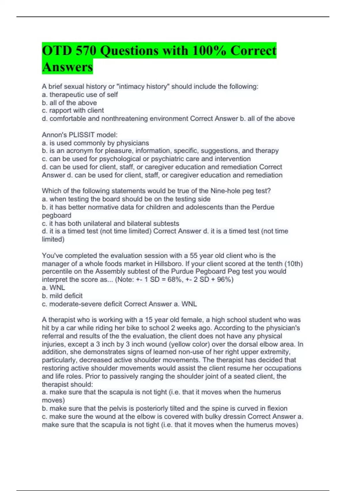 A brief sexual history or "intimacy history" should include the following: a. therapeutic use of self b. all of the above c. rapport with client d. comfortable and nonthreatening environment Correct Answer b. all of the above Annon's PLISSIT model: a. is used commonly by physicians b. is an acronym for pleasure, information, specific, suggestions, and therapy c. can be used for psychological or psychiatric care and intervention d. can be used for client, staff, or caregiver education and remediation Correct Answer d. can be used for client, staff, or caregiver education and remediation Which of the following statements would be true of the Nine-hole peg test? a. when testing the board should be on the testing side b. it has better normative data for children and adolescents than the Perdue pegboard c. it has both unilateral and bilateral subtests d. it is a timed test (not time limited) Correct Answer d. it is a timed test (not time limited) You've completed the evaluation session with a 55 year old client who is the manager of a whole foods market in Hillsboro. If your client scored at the tenth (10th) percentile on the Assembly subtest of the Purdue Pegboard Peg test you would interpret the score as... (Note: +- 1 SD = 68%, +- 2 SD + 96%) a. WNL b. mild deficit c. moderate-severe deficit Correct Answer a. WNL A therapist who is working with a 15 year old female, a high school student who was hit by a car while riding her bike to school 2 weeks ago. According to the physician's referral and results of the the evaluation, the client does not have any physical injuries, except a 3 inch by 3 inch wound (yellow color) over the dorsal elbow area. In addition, she demonstrates signs of learned non-use of her right upper extremity, particularly, decreased active shoulder movements. The therapist has decided that restoring active shoulder movements would assist the client resume her occupations and life roles. Prior to passively ranging the shoulder joint of a seated client, the therapist should: a. make sure that the scapula is not tight (i.e. that it moves when the humerus moves) b. make sure that the pelvis is posteriorly tilted and the spine is curved in flexion c. make sure the wound at the elbow is covered with bulky dressin Correct Answer a. make sure that the scapula is not tight (i.e. that it moves when the humerus moves) You work with a 75 year old male who enjoys volunteering as a literacy teacher at a local elementary school. He reports experiencing several episodes of having difficulty using his left upper extremity to getting his cellphone out of his backpack placed on the floor. After checking the ROM of the left upper extremity, you notice that you are able to move his elbow to touch the shoulder. He is able to touch his shoulder by himself, but you noticed that his whole body tilts to the right side. What would you interpret your client's problem? a. he has ROM limitation b. he may have muscle weakness at the elbow c. he may have a cognitive problem as he did not follow the evaluation instructions d. his condition is within functional/normal limits Correct Answer b. he may have muscle weakness at the elbow Your colles fracture client is in a forearm cast. The MD has ordered a controlled range of motion program. You are seeing the patient 3 weeks post-injury (there is no clinical union), according to the biomechanical approach, which of the following should be part of your treatment? (choose all that apply) a. grip and pinch strength testing b. active ranging of shoulder through full arc c. active motion of fingers and thumb through full arc d. strengthening to elbow flexion/extension Correct Answer b. active ranging of shoulder through full arc c. active motion of fingers and thumb through full arc If you were working with a person who had a heart attack 4 months ago, which of the following types of intervention activities would you avoid? a. loading dishes into the dishwasher from the countertop b. putting empty cardboard boxes in the recycling bin c. carrying a bag of groceries into the house from the garage d. preparing a bowl of salad for lunch Correct Answer c. carrying a bag of groceries into the house from the garage If the 10 RM of your client's wrist extensors was 6 lbs. and you chose progressive resistive exercise (PRE) method as a method of strengthening, what weight would you use for the first 10 repetitions? a. 10 lbs b. 4.5 lbs c. 6 lbs d. 3 lbs Correct Answer d. 3 lbs You are working with a client who has fair minus (3-) elbow extension. Which of the following activities/exercises would be most appropriate to begin strengthening her elbow extensors (assume your client is seated at a standard height table)? a. playing checkers using checkers pieces stabilized by small pegs and with the checkerboard tilted down 20 degrees on a standard height table (far end is low) b. bilateral sanding with 5lb of resistance and 30 degree incline c. playing checkers using checker pieces stabilized by small pegs and with the checkerboard tilted up at a 40 degree angle on a standard height table and graded up (far end is high)