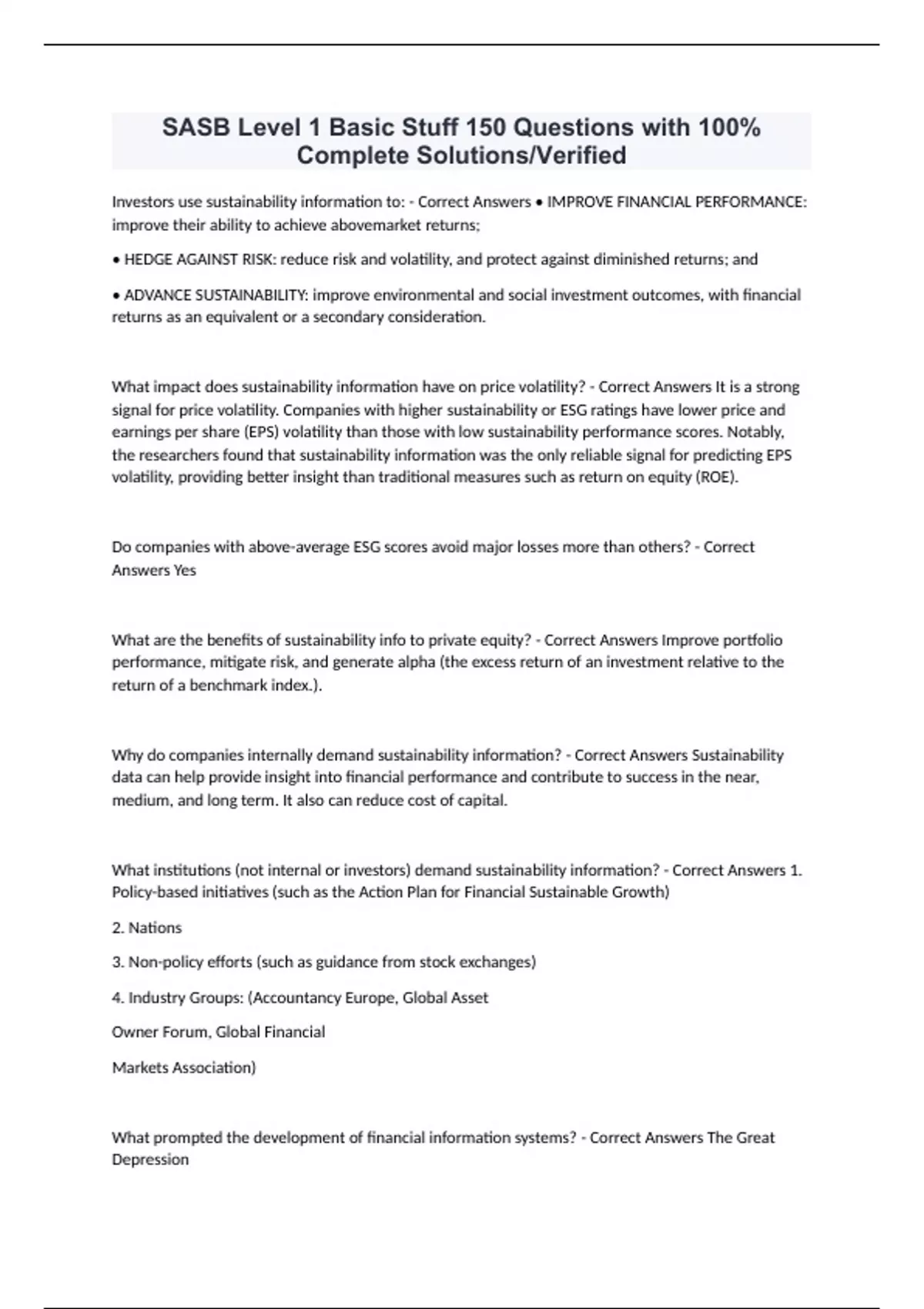 SASB Level 1 Basic Stuff 150 Questions with 100% Complete Solutions/Verified Investors use sustainability information to: - Correct Answers • IMPROVE FINANCIAL PERFORMANCE: improve their ability to achieve abovemarket returns; • HEDGE AGAINST RISK: reduce risk and volatility, and protect against diminished returns; and • ADVANCE SUSTAINABILITY: improve environmental and social investment outcomes, with financial returns as an equivalent or a secondary consideration. What impact does sustainability information have on price volatility? - Correct Answers It is a strong signal for price volatility. Companies with higher sustainability or ESG ratings have lower price and earnings per share (EPS) volatility than those with low sustainability performance scores. Notably, the researchers found that sustainability information was the only reliable signal for predicting EPS volatility, providing better insight than traditional measures such as return on equity (ROE). Do companies with above-average ESG scores avoid major losses more than others? - Correct Answers Yes What are the benefits of sustainability info to private equity? - Correct Answers Improve portfolio performance, mitigate risk, and generate alpha (the excess return of an investment relative to the return of a benchmark index.). Why do companies internally demand sustainability information? - Correct Answers Sustainability data can help provide insight into financial performance and contribute to success in the near, medium, and long term. It also can reduce cost of capital. What institutions (not internal or investors) demand sustainability information? - Correct Answers 1. Policy-based initiatives (such as the Action Plan for Financial Sustainable Growth) 2. Nations 3. Non-policy efforts (such as guidance from stock exchanges) 4. Industry Groups: (Accountancy Europe, Global Asset Owner Forum, Global Financial Markets Association) What prompted the development of financial information systems? - Correct Answers The Great Depression