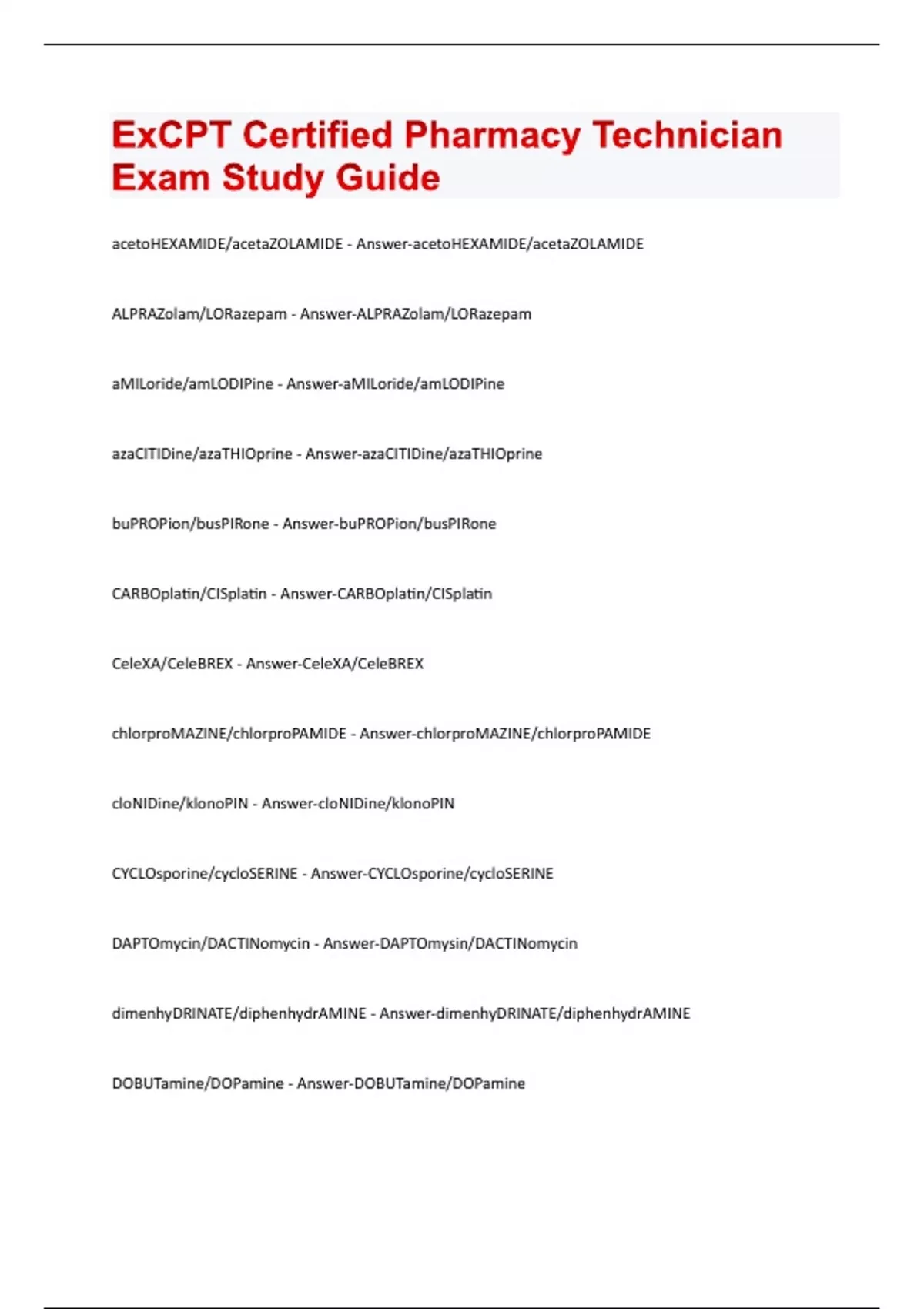 acetoHEXAMIDE/acetaZOLAMIDE - Answer-acetoHEXAMIDE/acetaZOLAMIDE ALPRAZolam/LORazepam - Answer-ALPRAZolam/LORazepam aMILoride/amLODIPine - Answer-aMILoride/amLODIPine azaCITIDine/azaTHIOprine - Answer-azaCITIDine/azaTHIOprine buPROPion/busPIRone - Answer-buPROPion/busPIRone CARBOplatin/CISplatin - Answer-CARBOplatin/CISplatin CeleXA/CeleBREX - Answer-CeleXA/CeleBREX chlorproMAZINE/chlorproPAMIDE - Answer-chlorproMAZINE/chlorproPAMIDE cloNIDine/klonoPIN - Answer-cloNIDine/klonoPIN CYCLOsporine/cycloSERINE - Answer-CYCLOsporine/cycloSERINE DAPTOmycin/DACTINomycin - Answer-DAPTOmysin/DACTINomycin dimenhyDRINATE/diphenhydrAMINE - Answer-dimenhyDRINATE/diphenhydrAMINE DOBUTamine/DOPamine - Answer-DOBUTamine/DOPamineDOXorubicin/IDArubicin - Answer-DOXorubicin/IDArubicin DULoxetine/FLUoxetine - Answer-DULoxetine/FLUoxetine ePHEDrine/EPINEPHrine - Answer-ePHEDrine/EPINEPHrine fentaNYL/SUFentanil - Answer-fentaNYL/SUFentanil glipiZIDE/glyBURIDE - Answer-glipiZIDE/glyBURIDE guaiFENesin/GuanFACINE - Answer-guaiFENesin/GuanFACINE hydrALAZINE/HydrOXYzine - Answer-hydrALAZINE/HydrOXYzine HYDROcodone/OxyCODONE - Answer-HYDROcodone/OxyCODONE LamiVUDine/LamoTRIgine - Answer-LamiVUDine/LamoTRIgine LamISIL/LaMICtal - Answer-LamISIL/LaMICtal metroNIDAZOLE/metFORMIN - Answer-metroNIDAZOLE/metFORMIN miFEPRIStone/miSOPROStol - Answer-miFEPRIStone/miSOPROStol mitoMYcin/mitoXANTRONE - Answer-mitoMYcin/mitoXANTRONE NexAVAR/NexIUM - Answer-NexAVAR/NexIUMNiCARdipine/NIFEdipine - Answer-NiCARdipine/NIFEdipine NovoLIN/NovoLOG - Answer-NovoLIN/NovoLOG