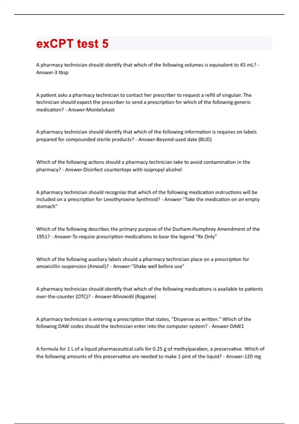 A pharmacy technician should identify that which of the following volumes is equivalent to 45 mL? - Answer-3 tbsp A patient asks a pharmacy technician to contact her prescriber to request a refill of singulair. The technician should expect the prescriber to send a prescription for which of the following generic medication? - Answer-Montelukast A pharmacy technician should identify that which of the following information is requires on labels prepared for compounded sterile products? - Answer-Beyond-used date (BUD) Which of the following actions should a pharmacy technician take to avoid contamination in the pharmacy? - Answer-Disinfect countertops with isopropyl alcohol A pharmacy technician should recognize that which of the following medication instructions will be included on a prescription for Levothyroxine Synthroid? - Answer-"Take the medication on an empty stomach" Which of the following describes the primary purpose of the Durham-Humphrey Amendment of the 1951? - Answer-To require prescription medications to bear the legend "Rx Only" Which of the following auxiliary labels should a pharmacy technician place on a prescription for amoxicillin suspension (Amoxil)? - Answer-"Shake well before use" A pharmacy technician should identify that which of the following medications is available to patients over-the-counter (OTC)? - Answer-Minoxidil (Rogaine) A pharmacy technician is entering a prescription that states, "Dispense as written." Which of the following DAW codes should the technician enter into the computer system? - Answer-DAW1 A formula for 1 L of a liquid pharmaceutical calls for 0.25 g of methylparaben, a preservative. Which of the following amounts of this preservative are needed to make 1 pint of the liquid? - Answer-120 mgWhich of the following should a pharmacy technician identify as the brand name for Alendronate? - Answer-Fosamax Which of the following should a pharmacy technician recognize as an adverse effect of taking Methylphenidate (Ritalin)? - Answer-Weight loss Which of the following should a pharmacy technician identify as the primary purpose of MedWatch? - Answer-To allow the voluntary report of adverse events Which of the following is a security requirement for noncontrolled Medicaid prescription set forth by the Centers for Medicare and Medicaid Services (CMS)? - Answer-The prescription is required to be written on a tamper-resistant pad A pharmacy technician is compounding an IV prescription. Which of the following actions should the technician take to demonstrate best practice for quality assurance? - Answer-Use a bar code verification system A pharmacy technician should identify that which of the following federal acts requires a patient to receive a pharmacist counseling? - Answer-Omnibus Budget Reconciliation Act of 1990 (OBRA '90) A patient's medication administration record indicates that he is receiving ampicillin-sulbactam (Unasyn) piggyback qid. The pharmacy technician should recognize that this medication is delivered via which of the following routes of administration? - Answer-Intravenous Injection When repackaging medications from a stock container to a unit-dose package, which of the following information should a pharmacy technician record? - Answer-The lot number of the medication According to federal law, which of the following is classified as Schedule II medication? - Answer-Cocaine Which of the following medications should a pharmacy technician identify as an over-the counter (OTC) medication that is used to treat diarrhea? - Answer-Loperamide (Imodium)A pharmacy technician is preparing a Clindamycin (Cleocin) oral suspension. Which of the following auxiliary labels should a technician place on the bottle? - Answer-"Take with a full glass of water"