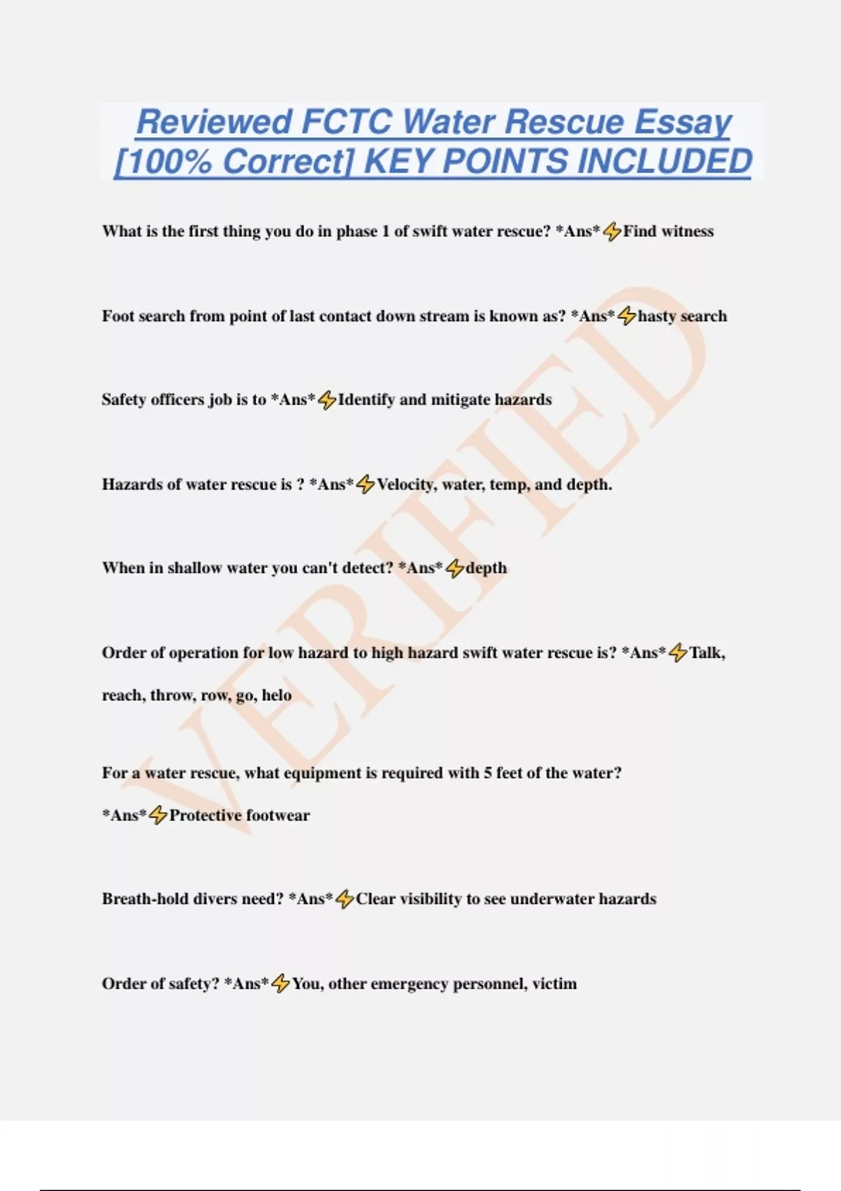 Reviewed FCTC Water Rescue Essay [100% Correct] KEY POINTS INCLUDED What is the first thing you do in phase 1 of swift water rescue? *Ans* Find witness Foot search from point of last contact down stream is known as? *Ans* hasty search Safety officers job is to *Ans* Identify and mitigate hazards Hazards of water rescue is ? *Ans* Velocity, water, temp, and depth. When in shallow water you can't detect? *Ans* depth Order of operation for low hazard to high hazard swift water rescue is? *Ans* Talk, reach, throw, row, go, helo For a water rescue, what equipment is required with 5 feet of the water? *Ans* Protective footwear Breath-hold divers need? *Ans* Clear visibility to see underwater hazards Order of safety? *Ans* You, other emer