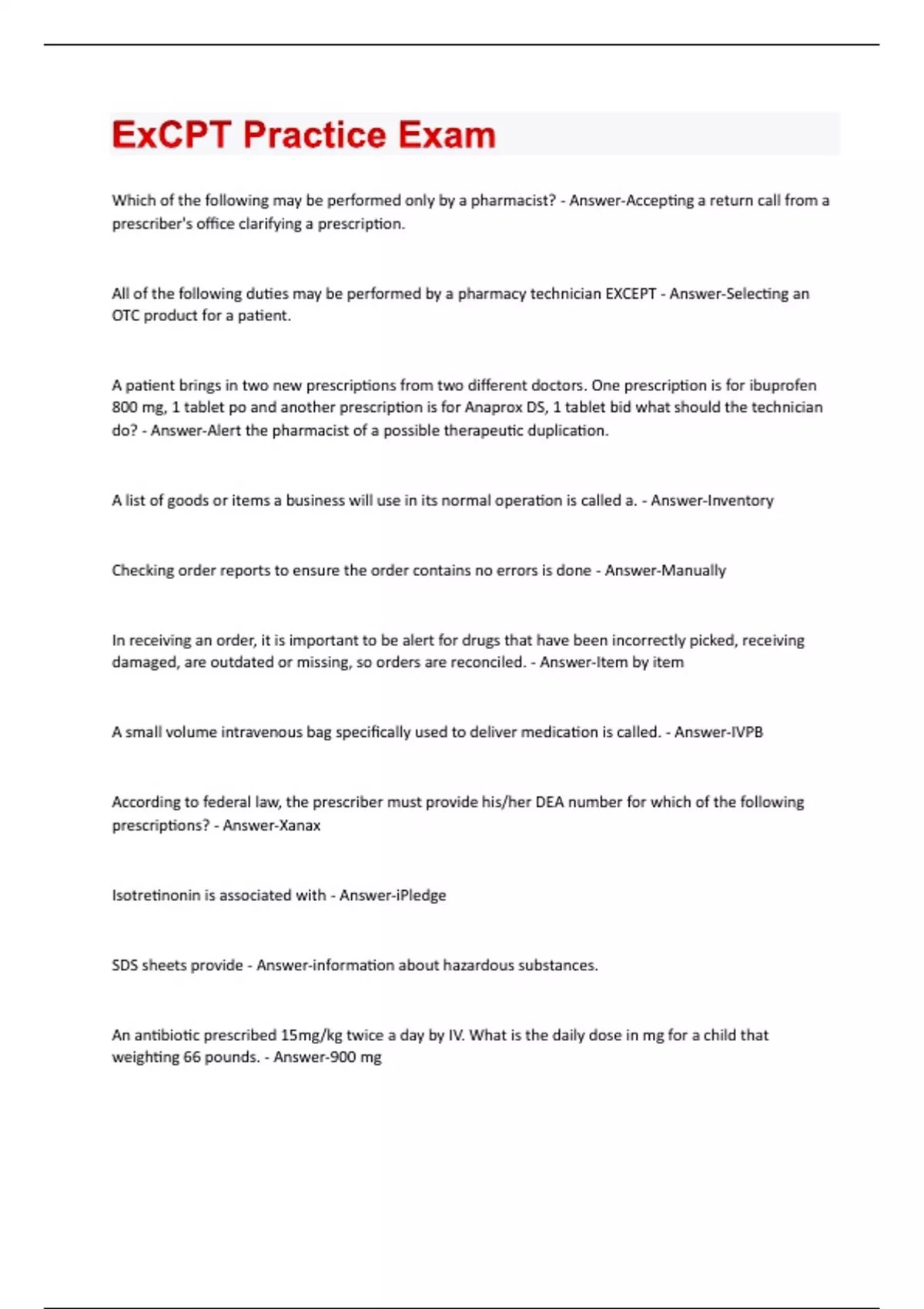 Which of the following may be performed only by a pharmacist? - Answer-Accepting a return call from a prescriber's office clarifying a prescription. All of the following duties may be performed by a pharmacy technician EXCEPT - Answer-Selecting an OTC product for a patient. A patient brings in two new prescriptions from two different doctors. One prescription is for ibuprofen 800 mg, 1 tablet po and another prescription is for Anaprox DS, 1 tablet bid what should the technician do? - Answer-Alert the pharmacist of a possible therapeutic duplication. A list of goods or items a business will use in its normal operation is called a. - Answer-Inventory Checking order reports to ensure the order contains no errors is done - Answer-Manually In receiving an order, it is important to be alert for drugs that have been incorrectly picked, receiving damaged, are outdated or missing, so orders are reconciled. - Answer-Item by item A small volume intravenous bag specifically used to deliver medication is called. - Answer-IVPB According to federal law, the prescriber must provide his/her DEA number for which of the following prescriptions? - Answer-Xanax Isotretinonin is associated with - Answer-iPledge SDS sheets provide - Answer-information about hazardous substances. An antibiotic prescribed 15mg/kg twice a day by IV. What is the daily dose in mg for a child that weighting 66 pounds. - Answer-900 mgOutdated drugs can be - Answer-sent to reverse distributors. An example of a major drug-drug interaction is - Answer-warfarin-aspirin The Patient ___________ is necessary for billing a prescription. - Answer-date of birth As you are putting away an order from a wholesaler, you notice one bottle is missing a label. The pharmacist tells you that the medication cannot be dispensed and must be returned to the wholesaler or destroyed. The drug cannot be dispensed because it is - Answer-misbranded Companies that administer drug benefit programs are called - Answer-PBMs Copy 2 of DEA form 222 is - Answer-forward to the DEA Proper disposal or destruction of non-returnable medications includes. - Answer-using a company that meets EPA regulations. Each tablet of Claritin D 12 hour contains 120 mg of pseudoephedrine sulfate. What is the maximum amount per transaction if the maximum amount per transaction pseudoephedrine is 3.6 g? - Answer-30 Exempt narcotics are in DEA schedule. - Answer-V or 5 Exempt narcotics are regulated for how many dosage units can be sold without a prescription in a ________ hour period. - Answer-48 hours Federal law requires pharmacies to keep ______+_ of the DEA form 22. - Answer-Copy 3 For asceptic technique, all work should be performed at least ________ inches inside the laminar flow hood. - Answer-6 inches All of the following are used to store medications except. - Answer-Shoe boxesCounseling as required by OBRA is provided by - Answer-Pharmacists. All of the following pharmacy personnel must be formally trained on HIPAA except. - Answer-none of the above For the following prescription, how much drug is take each day? Amoxicillin 250 mg/5 mL 150 mL, Sig: 2 teaspoons tid. - Answer-30 mL HIPAA is a federal law that protects a patient's PHI when it is. - Answer-all of the above The directions on a prescription read ii gtt q8h ou. The directions on the label should read. - AnswerInstill two drops in each eye every 8 hours. How many cases of 8 dram vials should be ordered to last two weeks if there are 500 vials per case and the pharmacy uses. - Answer-4 The common abbreviation ss means. - Answer-one half Which abbreviation is on the Joint Commission's "Do Not Use List" - Answer-qd How many grams of sucrose are needed to prepare 4 ounces of 20% solution - Answer-24 g How many milliliters of magnesium sulfate 4 mEq/mL are needed to add 10 mEq of magnesium sulfate to an IV bag? - Answer-2.5 mL Aseptic techniques are methods used to maintain. - Answer-Sterility How much hydrocortisone powder is needed to compound 60 g of hydrocortisone cream 2% - Answer- 1200 mgGood interpersonal skill include. - Answer-all the above How much should be withdrawn from a vial if the strength of the medication is 1 mg/mL and a dose of 5000 micrograms is needed - Answer-0.5 mL How should a prescription for BenzaCline be stored after it has been mixed? - Answer-Room Temperature Which dispensing code should be used for a prescription written for Cymbalta 20 mg if DAW was not written on the prescription. - Answer-0 If medication is to be taken PC when should it be taken. - Answer-After meals