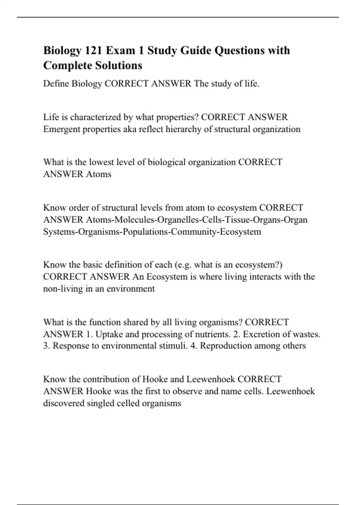 Biology 121 Exam 1 Study Guide Questions with Complete Solutions.