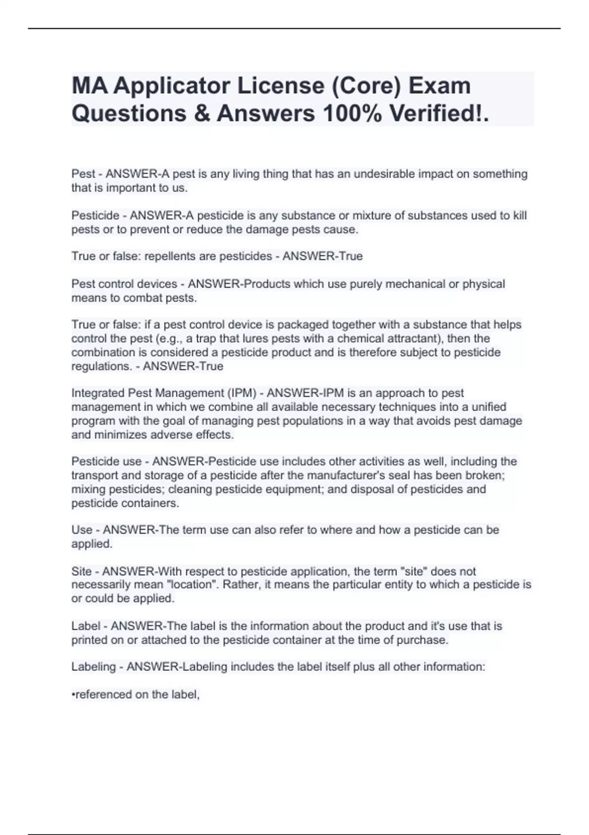 MA Applicator License (Core) Exam QuestioPest - ANSWER-A pest is any living thing that has an undesirable impact on something that is important to us. Pesticide - ANSWER-A pesticide is any substance or mixture of substances used to kill pests or to prevent or reduce the damage pests cause. True or false: repellents are pesticides - ANSWER-True Pest control devices - ANSWER-Products which use purely mechanical or physical means to combat pests. True or false: if a pest control device is packaged together with a substance that helps control the pest (e.g., a trap that lures pests with a chemical attractant), then the combination is considered a pesticide product and is therefore subject to pesticide regulations. - ANSWER-True Integrated Pest Management (IPM) - ANSWER-IPM is an approach to pest management in which we combine all available necessary techniques into a unified program with the goal of managing pest populations in a way that avoids pest damage and minimizes adverse effects. Pesticide use - ANSWER-Pesticide use includes other activities as well, including the transport and storage of a pesticide after the manufacturer's seal has been broken; mixing pesticides; cleaning pesticide equipment; and disposal of pesticides and pesticide containers. Use - ANSWER-The term use can also refer to where and how a pesticide can be applied. Site - ANSWER-With respect to pesticide application, the term "site" does not necessarily mean "location". Rather, it means the particular entity to which a pesticide is or could be applied. Label - ANSWER-The label is the information about the product and it's use that is printed on or attached to the pesticide container at the time of purchase. Labeling - ANSWER-Labeling includes the label itself plus all other information: ns & Answers 100% Verified!.