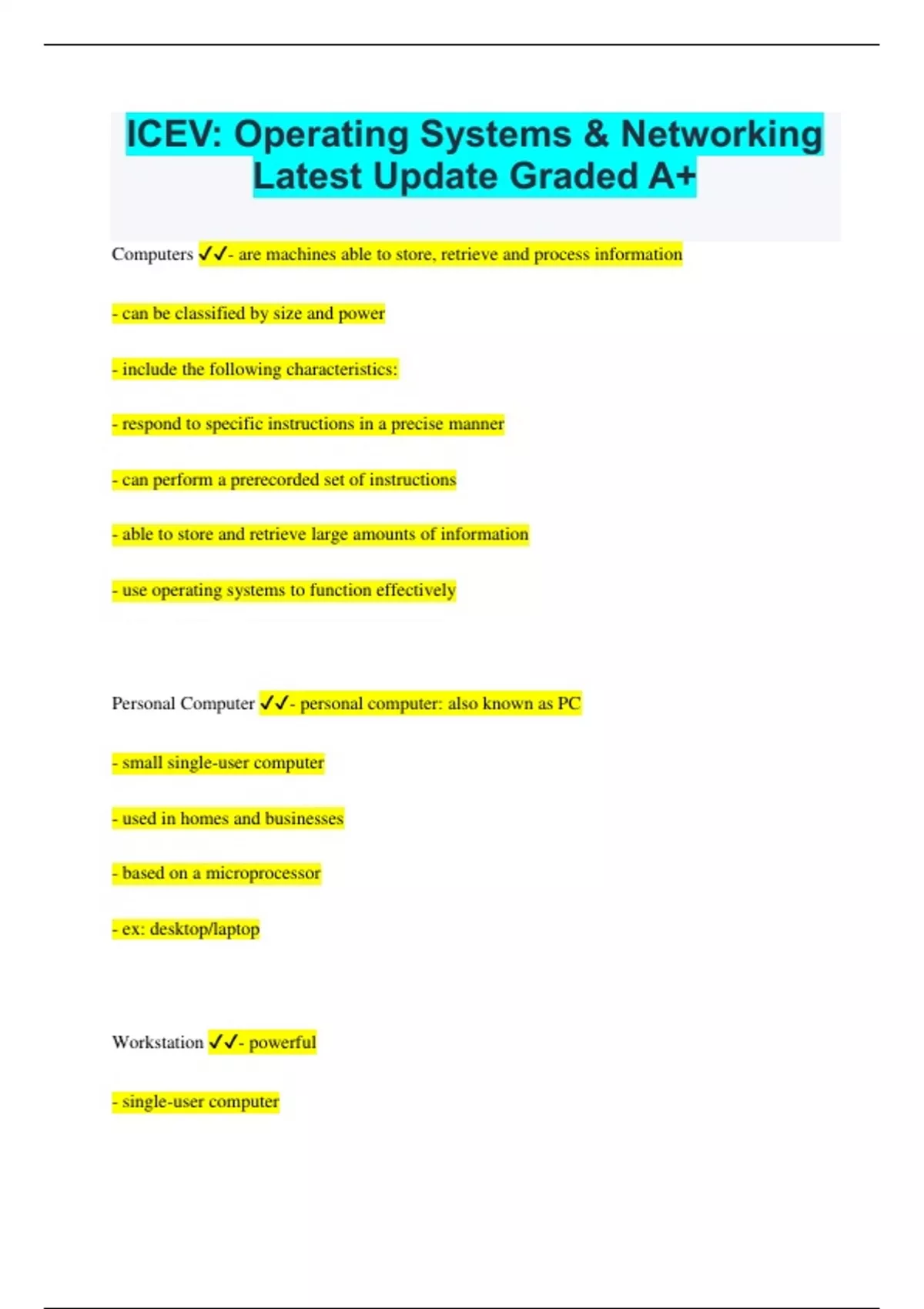 ICEV: Operating Systems & Networking Latest Update Graded A+ Computers - are machines able to store, retrieve and process information - can be classified by size and power - include the following characteristics: - respond to specific instructions in a precise manner - can perform a prerecorded set of instructions - able to store and retrieve large amounts of information - use operating systems to function effectively Personal Computer - personal computer: also known as PC - small single-user computer - used in homes and businesses - based on a microprocessor - ex: desktop/laptop Workstation - powerful - single-user computer - more powerful microprocessor than PC's Microprocessor the master control circuit of a computer Minicomputer - a multi-user computer - designed to handle hundreds of users at the same time Mainframe - a powerful multi-user computer - can support hundreds of thousands of users simultaneously Supercomputer - an extremely fast computer - can perform hundreds of millions of instructions every second Operating Systems - are programs acting as translators between a computer user and the computer itself - control and manage all other programs a computer contains - are the master program making everything else run - can be considered the core software on a computer linking the hardware, software and the computer user Hardware - the physical and mechanical components of a computer - ex: monitor, mouse, chips, keyboard, etc. Software - programs directing the operations
