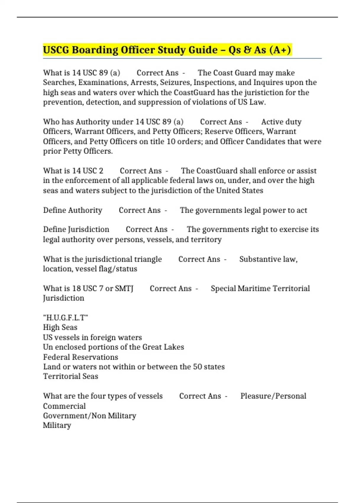 USCG Boarding Officer Study Guide – Qs & As (A+)