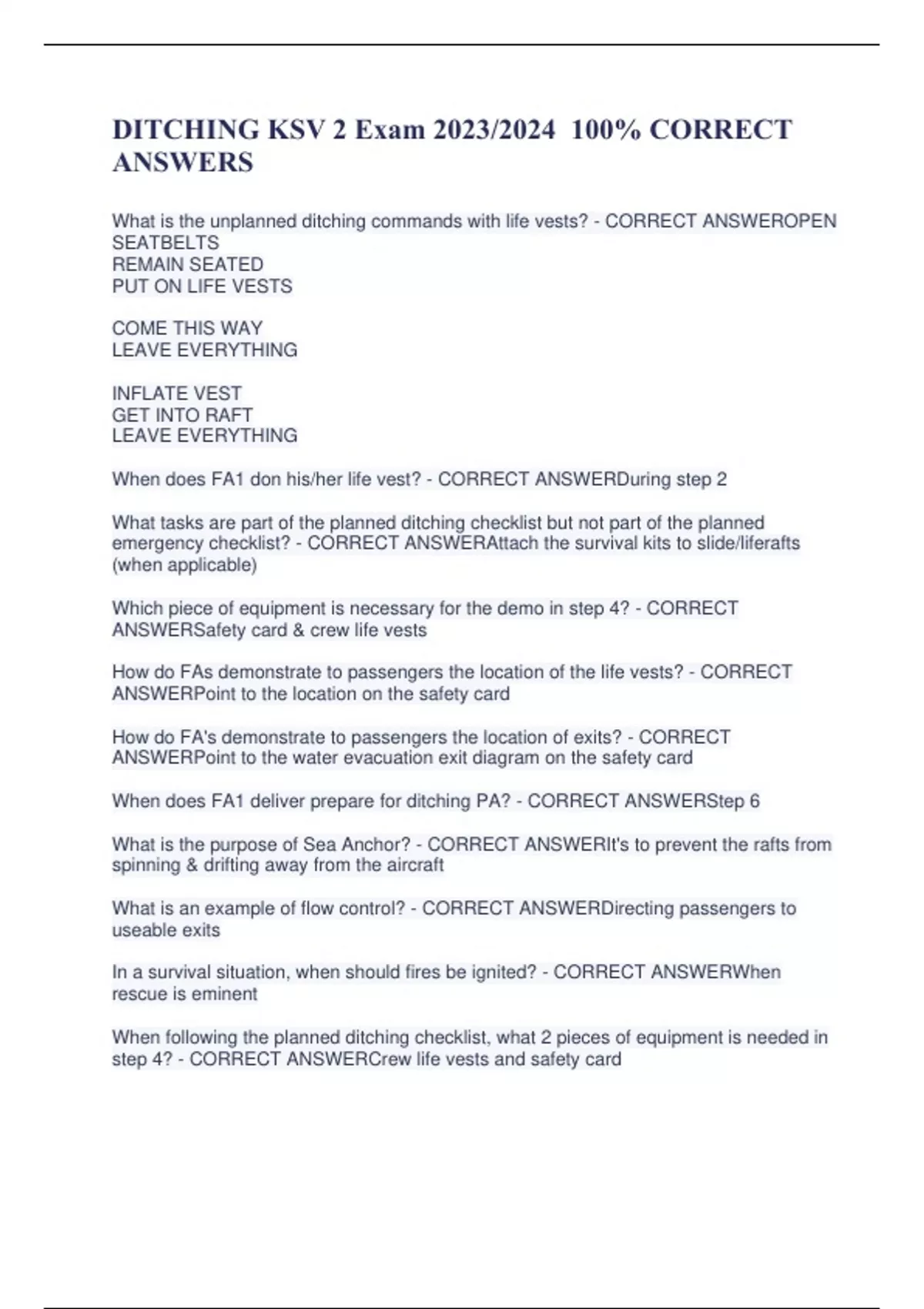 DITCHING KSV 2 Exam 2023/2024 100% CORRECT ANSWERS What is the unplanned ditching commands with life vests? - CORRECT ANSWEROPEN SEATBELTS REMAIN SEATED PUT ON LIFE VESTS COME THIS WAY LEAVE EVERYTHING INFLATE VEST GET INTO RAFT LEAVE EVERYTHING When does FA1 don his/her life vest? - CORRECT ANSWERDuring step 2 What tasks are part of the planned ditching checklist but not part of the planned emergency checklist? - CORRECT ANSWERAttach the survival kits to slide/liferafts (when applicable) Which piece of equipment is necessary for the demo in step 4? - CORRECT ANSWERSafety card & crew life vests How do FAs demonstrate to passengers the location of the life vests? - CORRECT ANSWERPoint to the location on the safety card How do FA's demonstrate to passengers the location of exits? - CORRECT ANSWERPoint to the water evacuation exit diagram on the safety card When does FA1 deliver prepare for ditching PA? - CORRECT ANSWERStep 6 What is the purpose of Sea Anchor? - CORRECT ANSWERIt's to prevent the rafts from spinning & drifting away from the aircraft What is an example of flow control? - CORRECT ANSWERDirecting passengers to useable exits In a survival situation, when should fires be ignited? - CORRECT ANSWERWhen rescue is eminent When following the planned ditching checklist, what 2 pieces of equipment is needed in step 4? - CORRECT ANSWERCrew life vests and safety car