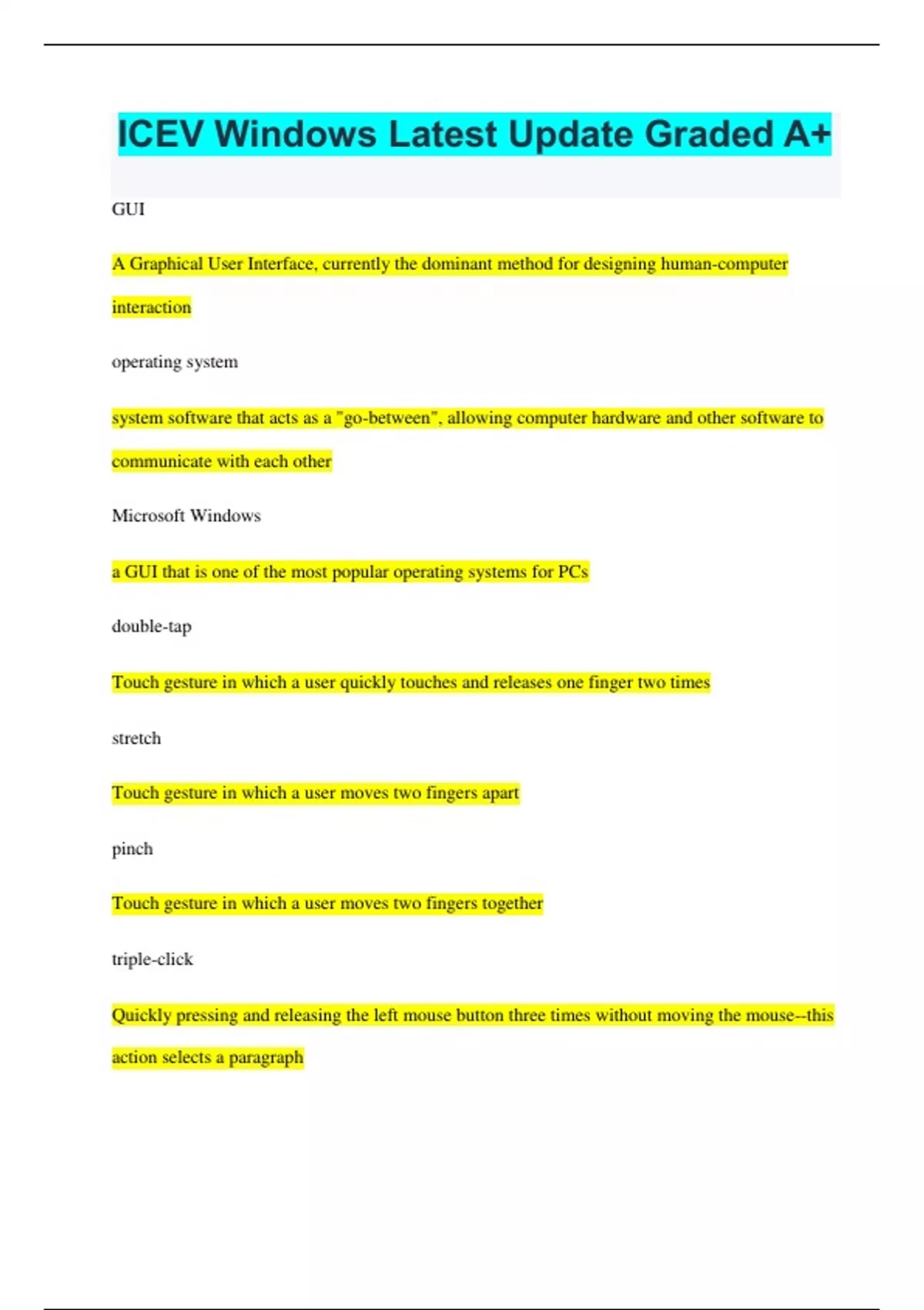 ICEV Windows Latest Update Graded A+ GUI A Graphical User Interface, currently the dominant method for designing human-computer interaction operating system system software that acts as a "go-between", allowing computer hardware and other software to communicate with each other Microsoft Windows a GUI that is one of the most popular operating systems for PCs double-tap Touch gesture in which a user quickly touches and releases one finger two times stretch Touch gesture in which a user moves two fingers apart pinch Touch gesture in which a user moves two fingers together triple-click Quickly pressing and releasing the left mouse button three times without moving the mouse--this action selects a paragraph right-click The use of the right mouse button to access special features of an application lock screen Displayed when you turn on a computer switch user locks your user account and displays the welcome screen so that another user can log on their account windows background the image that displays on the desktop task bar In "Windows," this is a bar displayed usually at the bottom edge of the desktop that is used to launch and monitor running applications. power button A button that can be configured to perform multiple functions, such as power the computer on/off and put it into sleep mode, and restart. desktop the area of the screen in graphical user interfaces, like Microsoft Windows, against which icons and windows appear apps applications; software that is accessed through the internet and runs on a computer, smartphone, tablet, or other mobile device--some people use app to refer to any computer program pinned application an application that is attached to the taskbar or the start menu for easy access restore down Return a maximized window to its previous size and position on the screen. minimize to remove an app from the view, but leave it active--it will be represented by an icon on the task bar Multitasking An operating system feature that allows more than one application to run at a time. snap feature This changes the way you resize open windows on your desktop. For example, by dragging a window to the edge of your screen, it will allow you to easily make it visible on that side of your screen and place another window beside it so that you can see them at the same time. files Collections of stored electronic data such as word processing documents, spreadsheets, presentations, and pictures folders