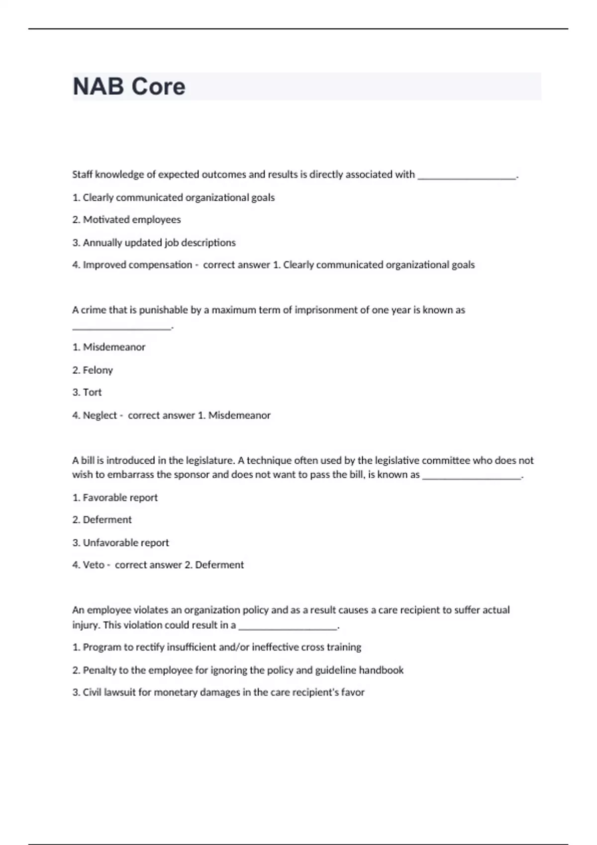 Staff knowledge of expected outcomes and results is directly associated with __________________. 1. Clearly communicated organizational goals 2. Motivated employees 3. Annually updated job descriptions 4. Improved compensation - correct answer 1. Clearly communicated organizational goals A crime that is punishable by a maximum term of imprisonment of one year is known as __________________. 1. Misdemeanor 2. Felony 3. Tort 4. Neglect - correct answer 1. Misdemeanor A bill is introduced in the legislature. A technique often used by the legislative committee who does not wish to embarrass the sponsor and does not want to pass the bill, is known as __________________. 1. Favorable report 2. Deferment 3. Unfavorable report 4. Veto - correct answer 2. Deferment An employee violates an organization policy and as a result causes a care recipient to suffer actual injury. This violation could result in a __________________. 1. Program to rectify insufficient and/or ineffective cross training 2. Penalty to the employee for ignoring the policy and guideline handbook 3. Civil lawsuit for monetary damages in the care recipient's favor