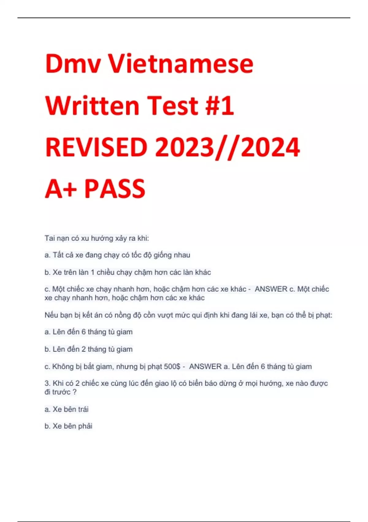 Dmv Vietnamese Written Test #1 REVISED 2023//2024 A+ PASS Tai nạn có xu hướng xảy ra khi: a. Tất cả xe đang chạy có tốc độ giống nhau b. Xe trên làn 1 chiều chạy chậm hơn các làn khác c. Một chiếc xe chạy nhanh hơn, hoặc chậm hơn các xe khác - ANSWER c. Một chiếc xe chạy nhanh hơn, hoặc chậm hơn các xe khác Nếu bạn bị kết án có nồng độ cồn vượt mức qui định khi đang lái xe, bạn có thể bị phạt: a. Lên đến 6 tháng tù giam b. Lên đến 2 tháng tù giam c. Không bị bắt giam, nhưng bị phạt 500$ - ANSWER a. Lên đến 6 tháng tù giam 3. Khi có 2 chiếc xe cùng lúc đến giao lộ có biển báo dừng ở mọi hướng, xe nào được đi trước ? a. Xe bên trái b. Xe bên phải c. Không xe nào - ANSWER b. Xe bên phải Bạn phải nhường cho người đi bộ có gậy trắng, hoặc chó dẫn đường: a. Chỉ khi chó dẫn đường đang dẫn người đi bộ b. Chỉ khi người đi bộ tuân thủ đèn giao thông c. Bất cứ lúc nào - ANSWER c. Bất cứ lúc nào Có 2 làn xe ở mỗi chiều. Bạn đang lái ở làn bên trái và có rất nhiều xe vượt bạn ở bên phải. Nếu tài xế sau xe bạn muốn lái nhanh hơn, bạn nên: a. Tiếp tục giữ làn để không cản trở lưu thông b. Lái vào lề bên trái để xe khác vượt bạn c. Di chuyển xe qua làn bên phải khi an toàn - ANSWER c. Di chuyển xe qua làn bên phải khi an toàn Bạn đang có ý định vượt xe khác, bạn nên: a. Giả sử họ không chừa chỗ để cho bạn quay trở lại làn cũ b. Giả sử họ cho bạn vượt nếu bạn sử dụng xi nhan c. Giả sử họ vẫn tiếp tục duy trì tốc độ hiện tại - ANSWER a. Giả sử họ không chừa chỗ để cho bạn quay trở lại làn cũ Bạn phải quan sát người lái mô tô đi chung làn bởi vì họ: a. Phải lái đối mặt với xe cộ đang đi tới b. Bất hợp pháp khi chia sẻ làn với mô tô c. Có quyền chia sẻ đường với bạn - ANSWER c. Có quyền chia sẻ đường với bạn Bật cần gạt kính chắn gió và sử dụng đèn xe vào ngày mưa, tuyết, hoặc sương mù: a. Sử dụng đèn pha b. Để tài xế khác thấy bạn c. Chỉ khi lái xe trên cao tốc - ANSWER b. Để tài xế khác thấy bạn Điều nào sau đúng được xe là lái xe thận trọng: a. Luôn phát hiện để ý những tai nạn có thể xảy ra trên đường b. Lái rất chậm c. Luôn vượt xe khác khi họ chạy chậm hơn bạn - ANSWER a. Luôn phát hiện để ý những tai nạn có thể xảy ra trên đường Trước khi ra khỏi xe đã đỗ ở bên đường, bạn nên: a. Đưa tín hiệu tay cho biết bạn đang ra khỏi xe b. Bật xi nhan trái c. Nhìn xem có xe đang vượt, xe đạp hay xe mô tô không - ANSWER c. Nhìn xem có xe đang vượt, xe đạp hay xe mô tô không Khi đỗ xe trên đồi, luôn luôn để dung thắng tay và: a. Đưa về vị trí Neutral b. Giữ bánh xe trước thẳng song song với