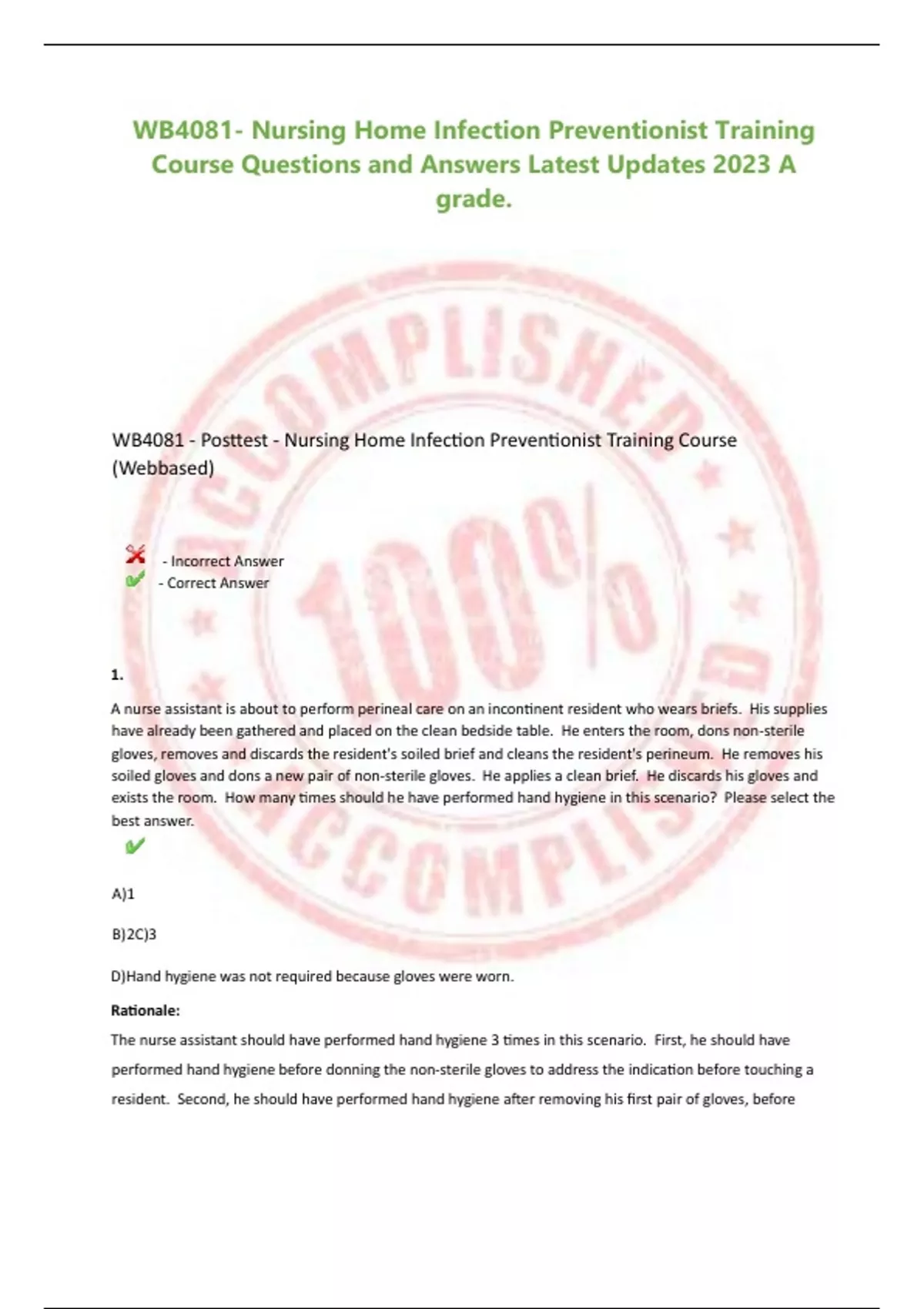 WB4081- Nursing Home Infection Preventionist Training Course Questions and Answers Latest Updates 2023 A grade. WB4081 - Posttest - Nursing Home Infection Preventionist Training Course (Webbased) - Incorrect Answer - Correct Answer 1. A nurse assistant is about to perform perineal care on an incontinent resident who wears briefs. His supplies have already been gathered and placed on the clean bedside table. He enters the room, dons non-sterile gloves, removes and discards the resident's soiled brief and cleans the resident's perineum. He removes his soiled gloves and dons a new pair of non-sterile gloves. He applies a clean brief. He discards his gloves and exists the room. How many times should he have performed hand hygiene in this scenario? Please select the best answer. A)1 B)2C)3 D)Hand hygiene was not required because gloves were worn. Rationale: The nurse assistant should have performed hand hygiene 3 times in this scenario. First, he should have performed hand hygiene before donning the non-sterile gloves to address the indication before touching a resident. Second, he should have performed hand hygiene after removing his first pair of gloves, before donning the second pair of gloves. This one act would address several indications: After a blood or body fluid exposure; after glove removal; and moving from a dirty task to a clean task. Third, performing hand hygiene after removing the second pair of gloves addresses the indications after glove removal and after touching the resident. (Module 7) 2. A resident is diagnosed with latent TB infection (LTBI). Is there risk that the resident will transmit TB to others in the facility? Please select the best answer. A)No, there is no risk of transmission at this time B)Yes, the resident is very likely to transmit infection to those who are immunocompromised C)No, the resident is not a risk because he/she will be placed in Airborne Precautions D)Yes, the resident is likely to transmit infection to close contacts Rationale: A resident with LTBI has M. tuberculosis in the body but does not have signs or symptoms of TB disease and cannot spread the infection to other people. Airborne Precautions are not required when caring for residents with LTBI. (Module 12b) 3. After you have scored the infection prevention and control (IPC) risk assessment, which of the following actions would you take first to address the findings? Please select the best answer. A)Develop a performance improvement effort B)Identify high-scoring items for IPC program prioritization C)Develop new (or review existing) IPC policies and procedures D)Provide education and training for staff Rationale: The first step would be to identify the high-scoring items for IPC program prioritization. Subsequent actions to address high-scoring items might include developing a performance improvement effort, developing or reviewing IPC policies and procedures, or providing education and training for staff. (Module 1) 4. As a result of lessons learned from outbreaks of multidrug-resistant organisms (MDROs) in nursing homes, which of the following situations should warrant use of Contact Precautions and consideration of a singleperson room for MDRO-colonized residents? Please select all that apply. A)Residents with difficulty containing sites of MDRO colonization and potential for extensive environmental contamination B)New residents on the unit are found to be colonized with the MDRO (evidence of ongoing transmission) despite efforts to control spread C)Residents with minimal medical or nursing care needs who are able to move independently throughout the facility D)Residents colonized with rare, highly-resistant MDROs Rationale: Nursing homes should implement Contact Precautions and