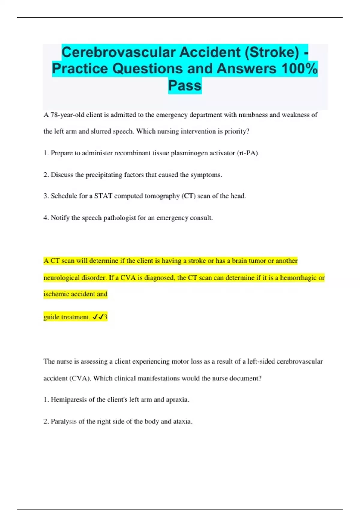 Cerebrovascular Accident (Stroke) - Practice Questions and Answers 100% Pass A 78-year-old client is admitted to the emergency department with numbness and weakness of the left arm and slurred speech. Which nursing intervention is priority? 1. Prepare to administer recombinant tissue plasminogen activator (rt-PA). 2. Discuss the precipitating factors that caused the symptoms. 3. Schedule for a STAT computed tomography (CT) scan of the head. 4. Notify the speech pathologist for an emergency consult. A CT scan will determine if the client is having a stroke or has a brain tumor or another neurological disorder. If a CVA is diagnosed, the CT scan can determine if it is a hemorrhagic or ischemic accident and guide treatment. 3 The nurse is assessing a client experiencing motor loss as a result of a left-sided cerebrovascular accident (CVA). Which clinical manifestations would the nurse document? 1. Hemiparesis of the client's left arm and apraxia. 2. Paralysis of the right side of the body and ataxia. 3. Homonymous hemianopsia and diplopia. 4. Impulsive behavior and hostility toward family. The most common motor dysfunction of a CVA is paralysis of one side of the body, hemiplegia; in this case with a left-sided CVA, the paralysis would affect the right side. Ataxia is an impaired ability to coordinate move 2 Which client would the nurse identify as being most at risk for experiencing a CVA? 1. A 55-year-old African American male. 2. An 84-year-old Japanese female. 3. A 67-year-old Caucasian male. 4. A 39-year-old pregnant female. African Americans have twice the rate of CVAs as Caucasians and men have a higher incidence than women; African Americans suffer more extensive damage from a CVA than do people of other cultural groups. 1 The client diagnosed with a right-sided cerebrovascular accident is admitted to the rehabilitation unit. Which interventions should be included in the nursing care plan? Select all that apply. 1. Position the client to prevent shoulder adduction. 2. Turn and reposition the client every shift. 3. Encourage the client to move the affected side. 4. Perform quadriceps exercises three (3) times a day. 5. Instruct the client to hold the fingers in a fist. 1. Placing a small pillow under the shoulder will prevent the shoulder from adducting toward the chest and developing a contracture. 3. The client should not ignore the paralyzed side, and the nurse must encourage the client to move it as much as possible; a written schedule may assist the client in exercising. 1, 3 The nurse is planning care for a client experiencing agnosia secondary to a cerebrovascular accident. Which collaborative intervention will be included in the plan of care? 1. Observe the client swallowing for possible aspiration. 2. Position the client in a semi-Fowler's position when sleeping. 3. Place a suction setup at the client's bedside during meals. 4. Refer the client to an occupational therapist for evaluation. A collaborative intervention is an intervention in which another health-care discipline—in this case, occupational therapy—is used in the care of the client. 4 The nurse and an unlicensed assistive personnel (UAP) are caring for a client with right-sided paralysis. Which action by the UAP requires the nurse to intervene? 1. The assistant places a gait belt around the client's waist prior to ambulating. 2. The assistant places the client on the back with the client's head to the side. 3. The assistant places a hand under the client's right axilla to move up in bed. 4. The assistant praises the client for attempting to perform ADLs independently. This action is inappropriate and would require intervention by the nurse because pulling on a flaccid shoulder joint could cause shoulder dislocation; the client should be pulled up by placing the arm underneath the back or using a lift sheet. 3 The client diagnosed with atrial fibrillation has experienced a transient ischemic attack (TIA). Which medication would the nurse anticipate being ordered for the client on discharge? 1. An oral anticoagulant medication. 2. A beta blocker medication. 3. An anti-hyperuricemic medication. 4. A thrombolytic medication.