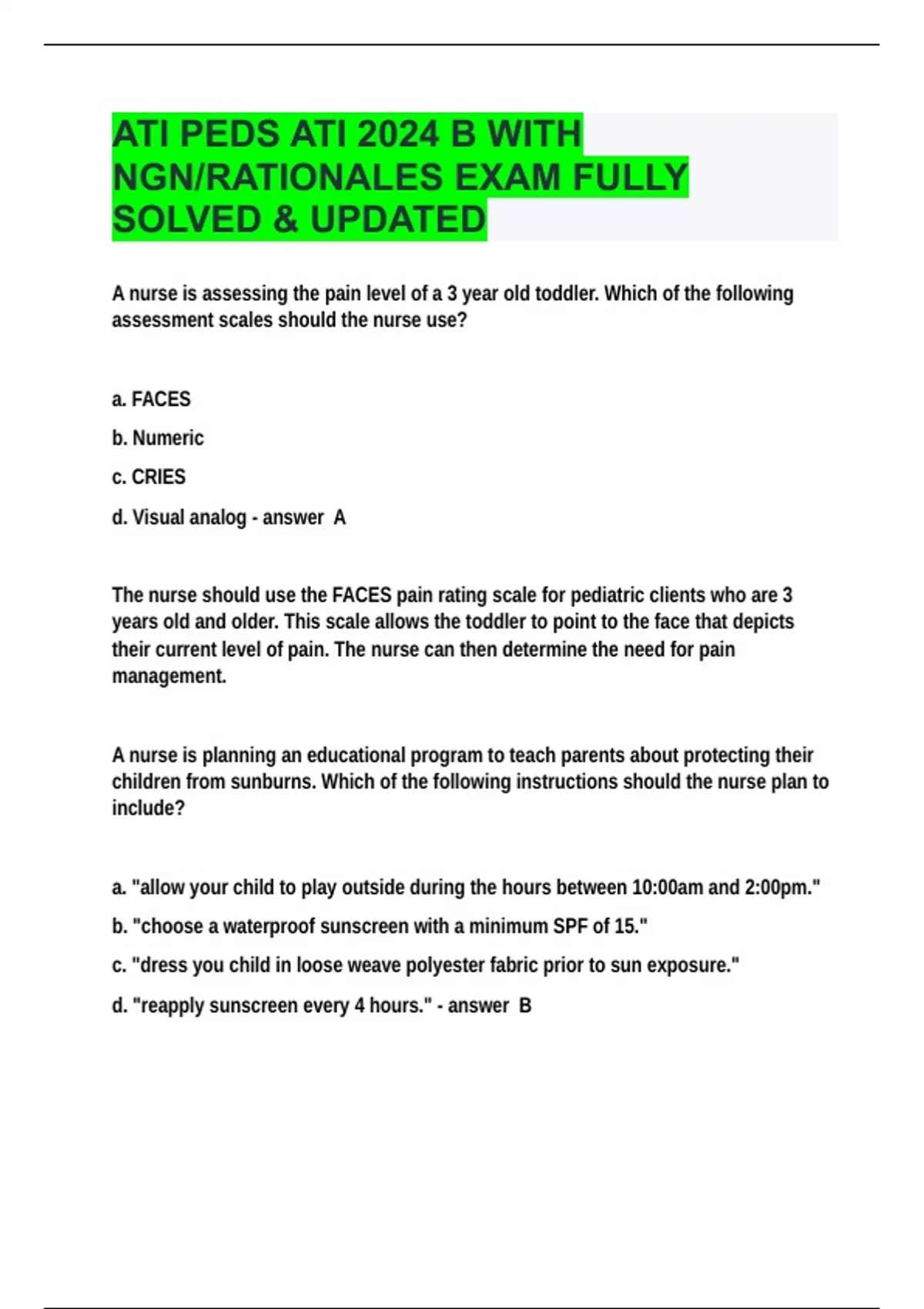 ATI PEDS ATI 2024 B WITH NGN RATIONALES EXAM FULLY SOLVED & UPDATED.