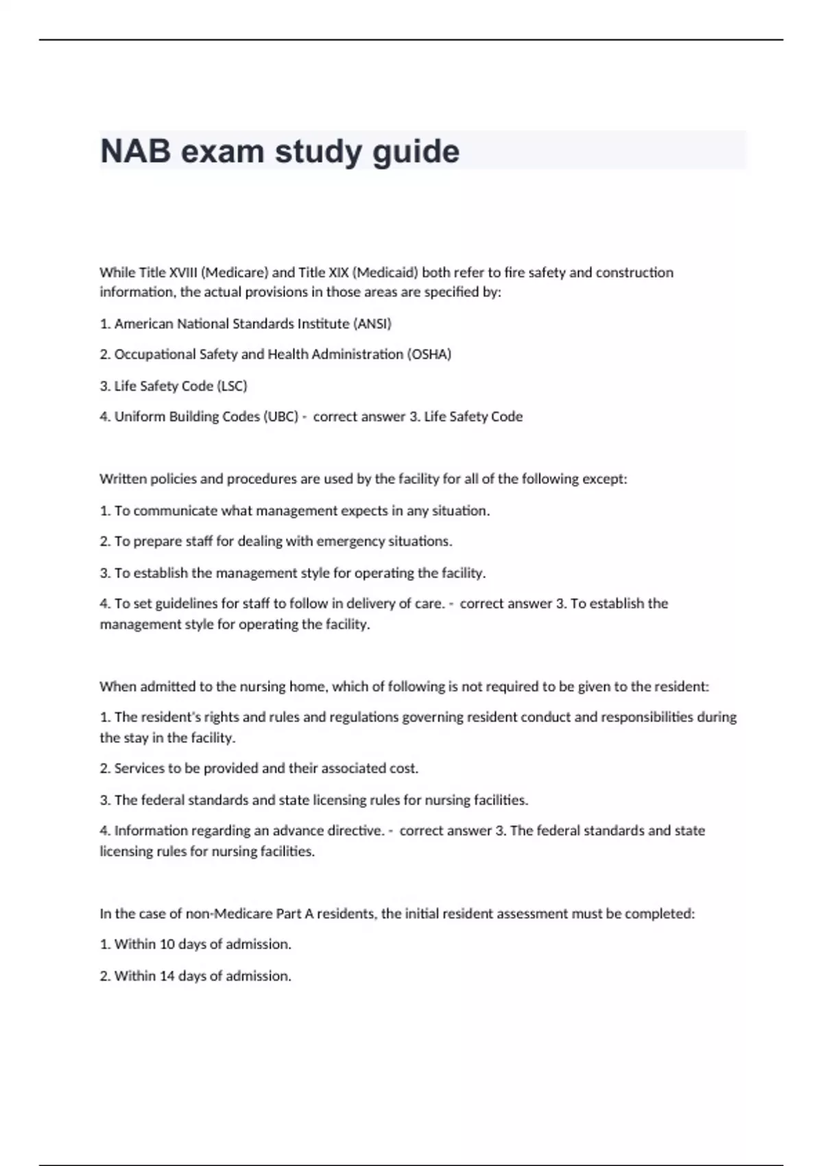 While Title XVIII (Medicare) and Title XIX (Medicaid) both refer to fire safety and construction information, the actual provisions in those areas are specified by: 1. American National Standards Institute (ANSI) 2. Occupational Safety and Health Administration (OSHA) 3. Life Safety Code (LSC) 4. Uniform Building Codes (UBC) - correct answer 3. Life Safety Code Written policies and procedures are used by the facility for all of the following except: 1. To communicate what management expects in any situation. 2. To prepare staff for dealing with emergency situations. 3. To establish the management style for operating the facility. 4. To set guidelines for staff to follow in delivery of care. - correct answer 3. To establish the management style for operating the facility. When admitted to the nursing home, which of following is not required to be given to the resident: 1. The resident's rights and rules and regulations governing resident conduct and responsibilities during the stay in the facility. 2. Services to be provided and their associated cost. 3. The federal standards and state licensing rules for nursing facilities. 4. Information regarding an advance directive. - correct answer 3. The federal standards and state licensing rules for nursing facilities. In the case of non-Medicare Part A residents, the initial resident assessment must be completed: 1. Within 10 days of admission. 2. Within 14 days of admission.