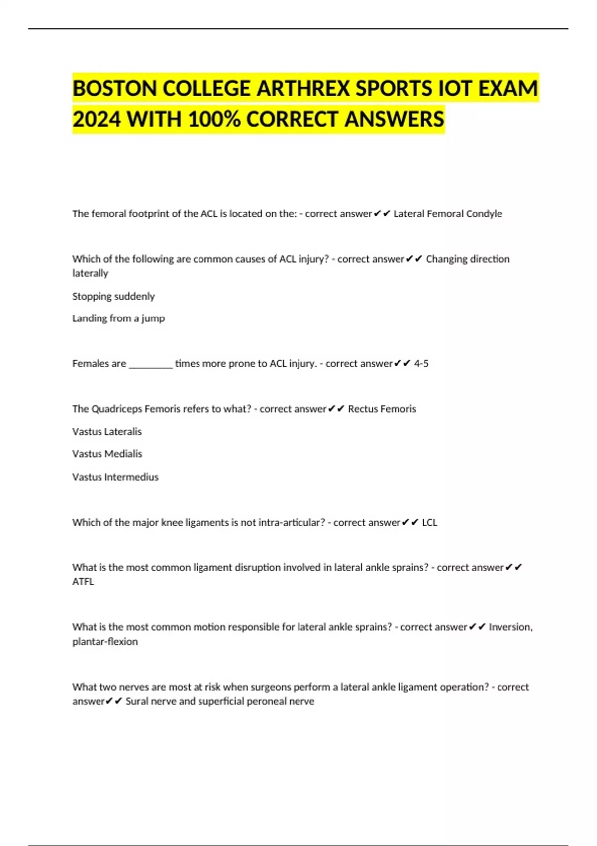 BOSTON COLLEGE ARTHREX SPORTS IOT EXAM 2024 WITH 100% CORRECT ANSWERS The femoral footprint of the ACL is located on the: - correct answer Lateral Femoral Condyle Which of the following are common causes of ACL injury? - correct answer Changing direction laterally Stopping suddenly Landing from a jump Females are ________ times more prone to ACL injury. - correct answer 4-5 The Quadriceps Femoris refers to what? - correct answer Rectus Femoris Vastus Lateralis Vastus Medialis Vastus Intermedius Which of the major knee ligaments is not intra-articular? - correct answer LCL What is the most common ligament disruption involved in lateral ankle sprains? - correct answer ATFL What is the most common motion responsible for lateral ankle sprains? - correct answer Inversion, planta