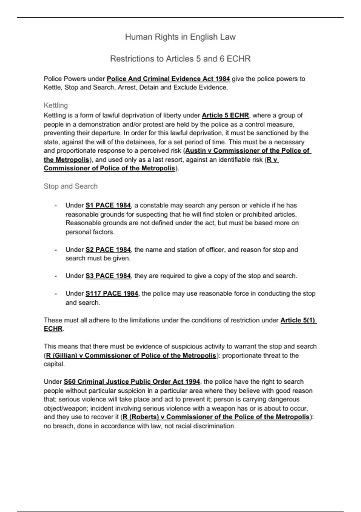 Comprehensive Summary of everything you need to know for OCR A Level Law, Paper 3, Section B: Human Rights Law. All case law and Legislation provided
