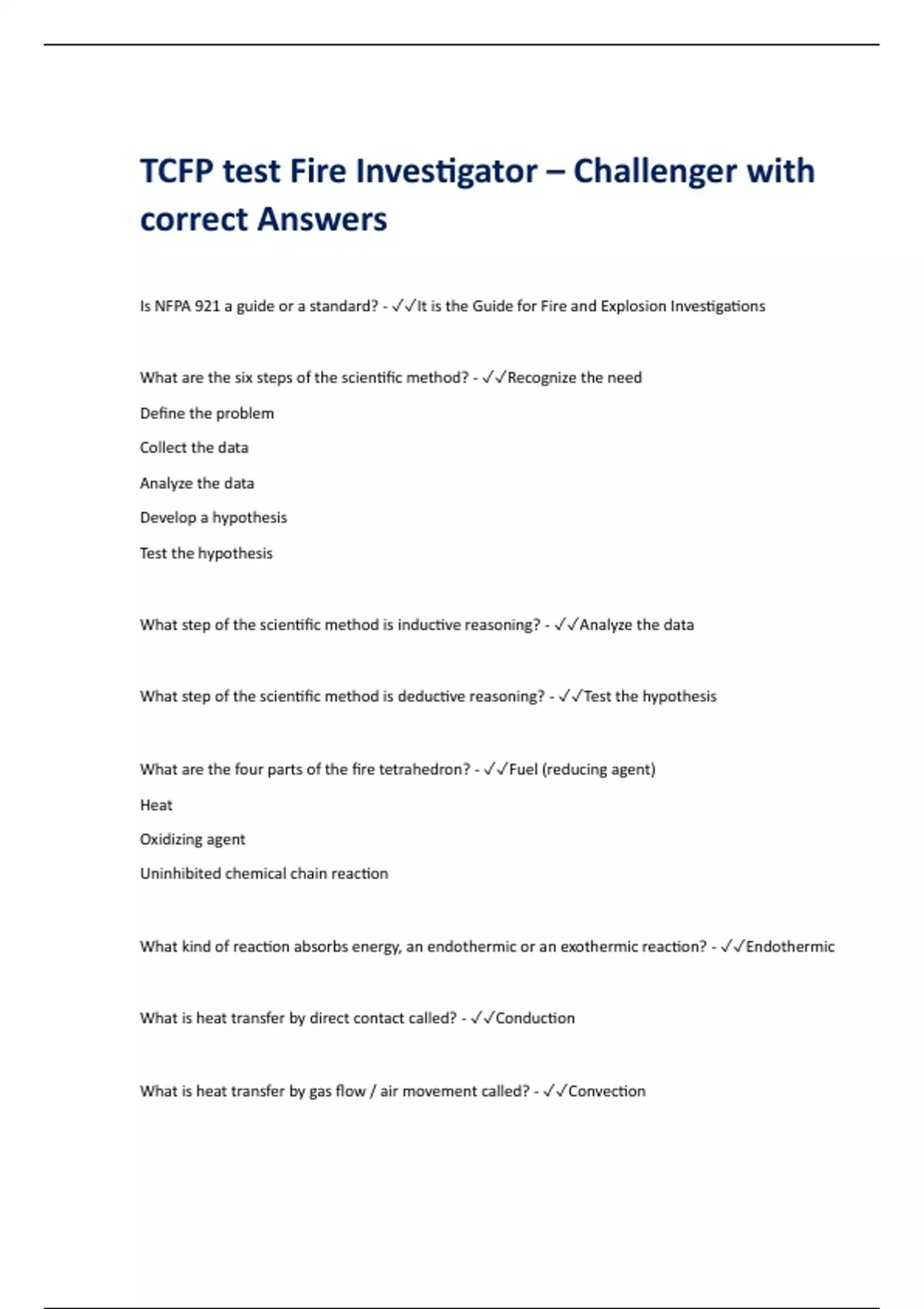 Is NFPA 921 a guide or a standard? - It is the Guide for Fire and Explosion Investigations What are the six steps of the scientific method? - Recognize the need Define the problem Collect the data Analyze the data Develop a hypothesis Test the hypothesis What step of the scientific method is inductive reasoning? - Analyze the data What step of the scientific method is deductive reasoning? - Test the hypothesis What are the four parts of the fire tetrahedron? - Fuel (reducing agent) Heat Oxidizing agent Uninhibited chemical chain reaction What kind of reaction absorbs energy, an endothermic or an exothermic reaction? - Endothermic What is heat transfer by direct contact called? - Conduction What is heat transfer by gas flow / air movement called? - Convection What is heat transfer by microwave energy called? - Radiation What is a fuel controlled fire? - A fire that is limited by the amount of combustibles. What is a ventilation controlled fire? - A fire that is limited by the amount of oxygen. What are the stages of fire growth? - Ignition Growth Flashover Fully Developed Decay What is a flashover? - The transition phase from growth to fully developed, where all surfaces reach ignition temperature almost simultaneously. What is ignition of the underside of the hot gas layer called? - Flameover or rollover What factors influence flashover conditions? - Size of the compartment Height of ceiling Ventilation Amount of fuel Layout of fuel Location of fire in the compartment What are fire patterns? - The physical manifestation of the affects of fire on materials. What are the different types of fire patterns on the walls and ceiling? - Plume Generated patterns (often V shaped) Ventilation generated patterns Hot gas layer patterns (Line of demarcation) What is spalling? - The separation of chunks of concrete with explosive force caused by the expansion of water (moisture) trapped in the concrete as it turns to steam What is char? - Pyrolized carbonaceo