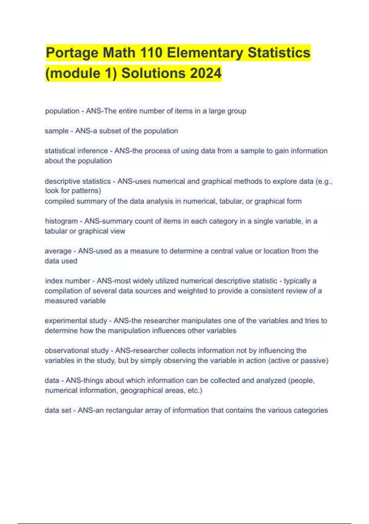 Portage Math 110 Elementary Statistics (module 1) Solutions 2024