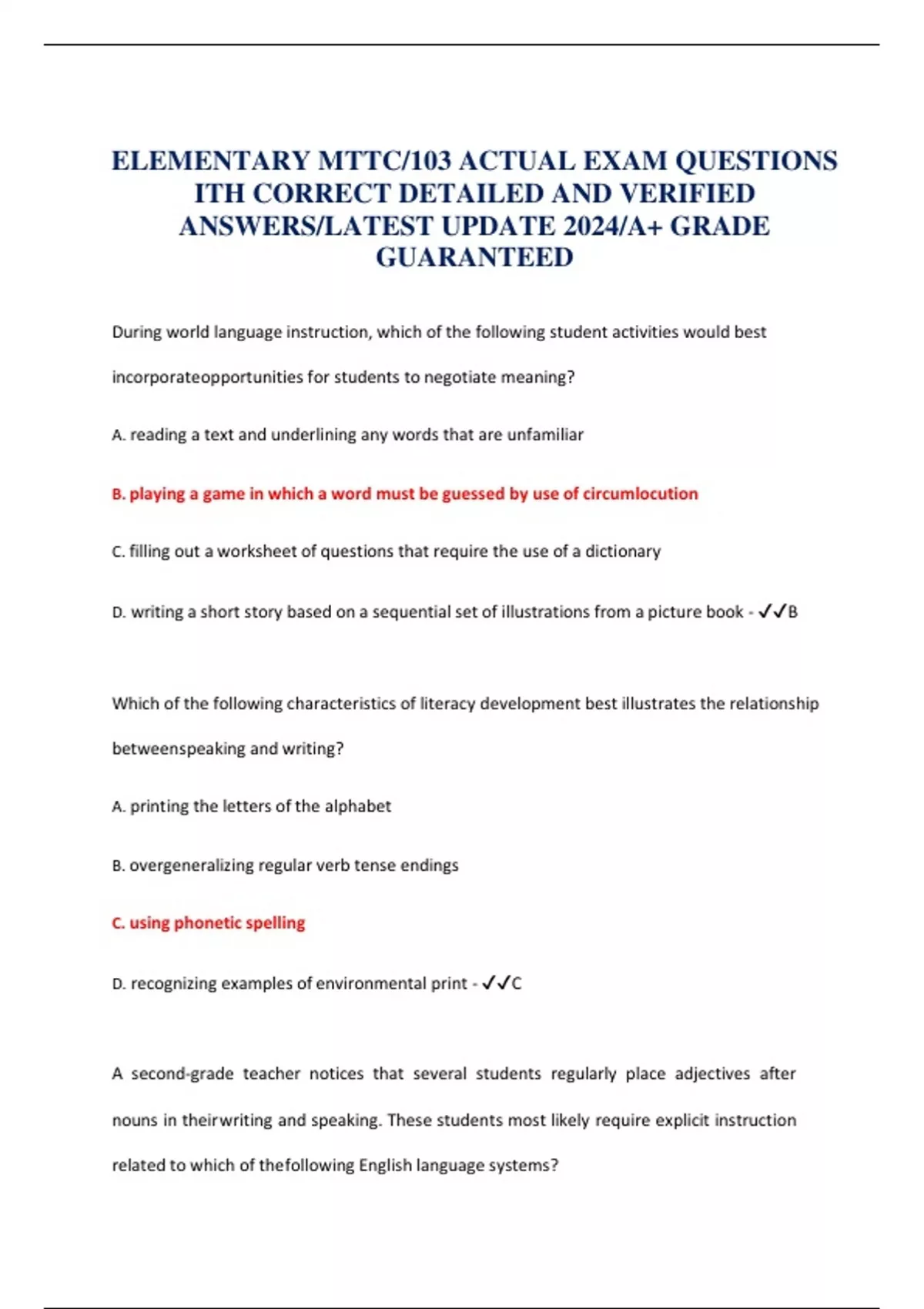 ELEMENTARY MTTC/103 ACTUAL EXAM QUESTIONS ITH CORRECT DETAILED AND VERIFIED ANSWERS/LATEST UPDATE 2024/A+ GRADE GUARANTEED