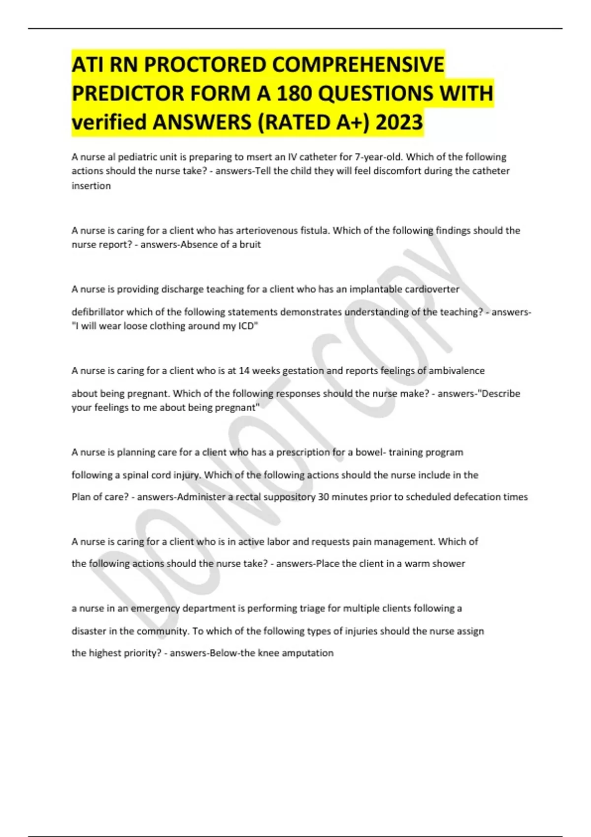 ATI RN PROCTORED COMPREHENSIVE PREDICTOR FORM A 180 QUESTIONS WITH verified ANSWERS (RATED A+) 2023 A nurse al pediatric unit is preparing to msert an IV catheter for 7-year-old. Which of the following actions should the nurse take? - answers-Tell the child they will feel discomfort during the catheter insertion