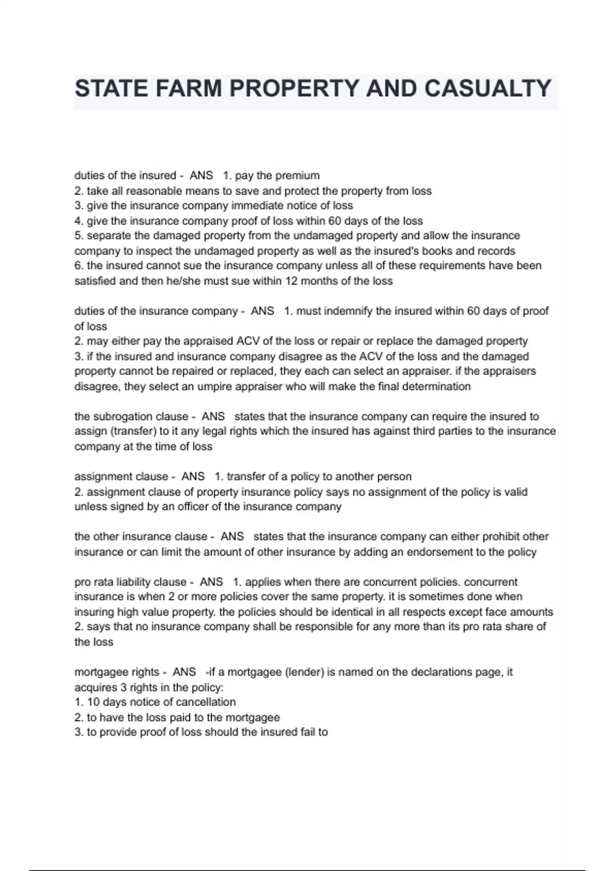 STATE FARM PROPERTY AND CASUALTY EXAM QUESTIONS AND ANSWERS duties of the insured - ANS 1. pay the premium 2. take all reasonable means to save and protect the property from loss 3. give the insurance company immediate notice of loss 4. give the insurance company proof of loss within 60 days of the loss 5. separate the damaged property from the undamaged property and allow the insurance company to inspect the undamaged property as well as the insured's books and records 6. the insured cannot sue the insurance company unless all of these requirements have been satisfied and then he/she must sue within 12 months of the loss duties of the insurance company - ANS 1. must indemnify the insured within 60 days of proof of loss 2. may either pay the appraised ACV of the loss or repair or replace the damaged property 3. if the insured and insurance company disagree as the ACV of the loss and the damaged property cannot be repaired or replaced, they each can select an appraiser. if the appraisers disagree, they select an umpire appraiser who will make the final determination the subrogation clause - ANS states that the insurance company can require the insured to assign (transfer) to it any legal rights which the insured has against third parties to the insurance company at the time of loss assignment clause - ANS 1. transfer of a policy to another person 2. assignment clause of property insurance policy says no assignment of the policy is valid unless signed by an officer of the insurance company the other insurance clause - ANS states that the insurance company can either prohibit other insurance or can limit the amount of other insurance by adding an endorsement to the policy pro rata liability clause - ANS 1. applies when there are concurrent policies. concurrent insurance is when 2 or more policies cover the same property. it is sometimes done when insuring high value property. the policies should be identical in all respects except face amounts 2. says that no insurance co