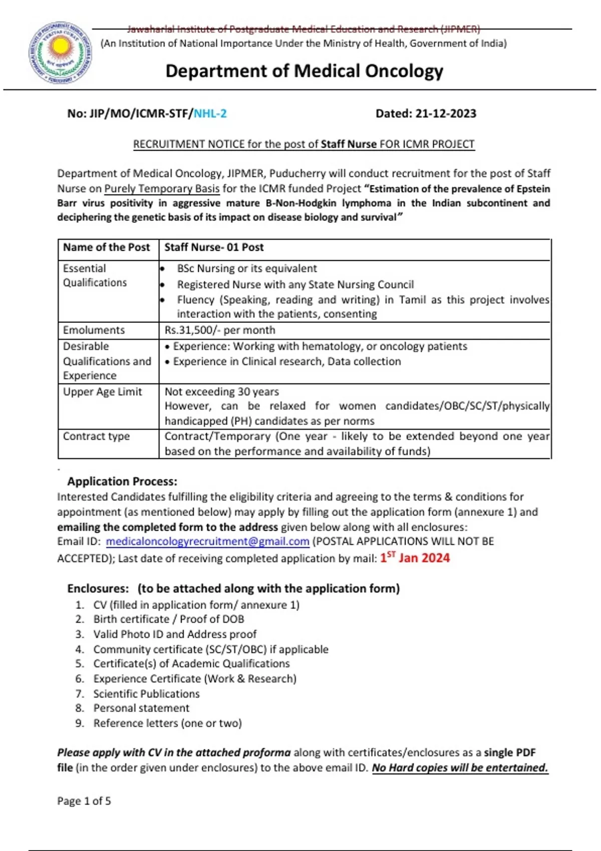 No: JIP/MO/ICMR-STF/NHL-2 Dated: 21-12-2023